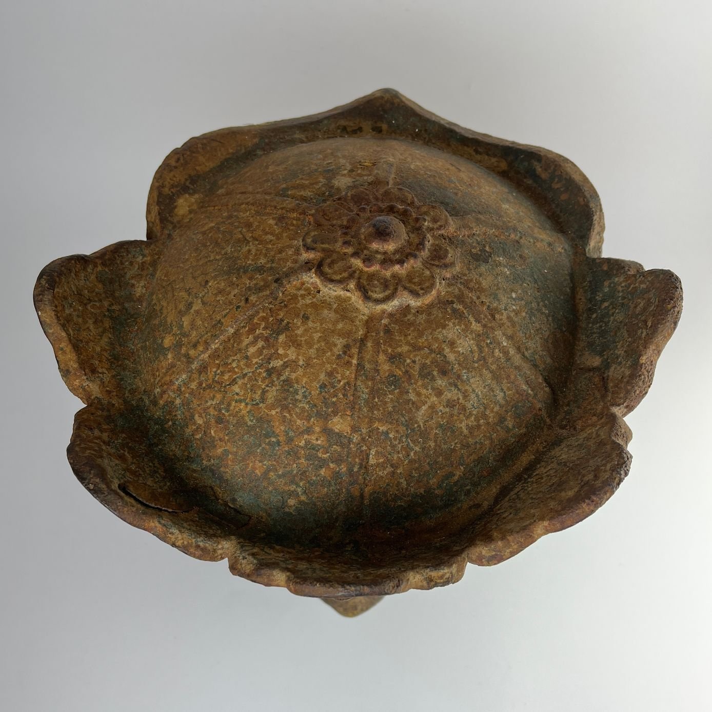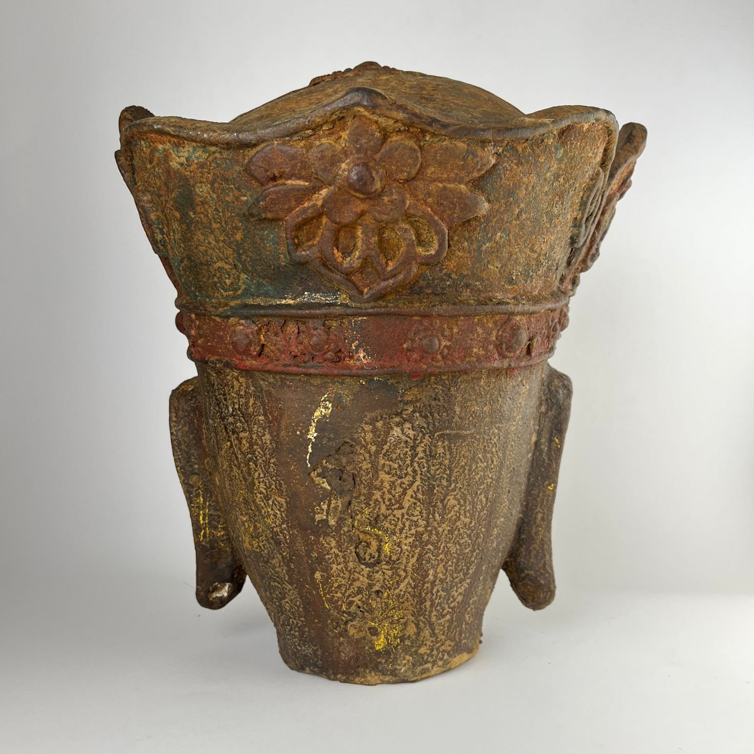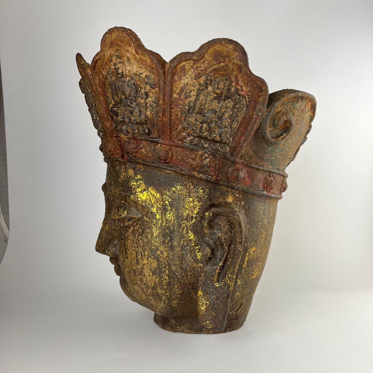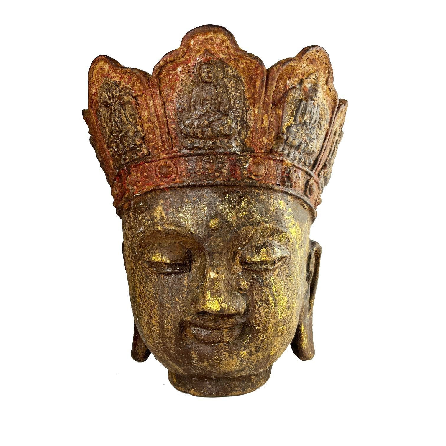 Escultura china en hierro fundido y policromado, con restos de dorado. «Cabeza de Buda con sombrero de los Cinco Tathagatas.» 30 x 26 x 28 cm.