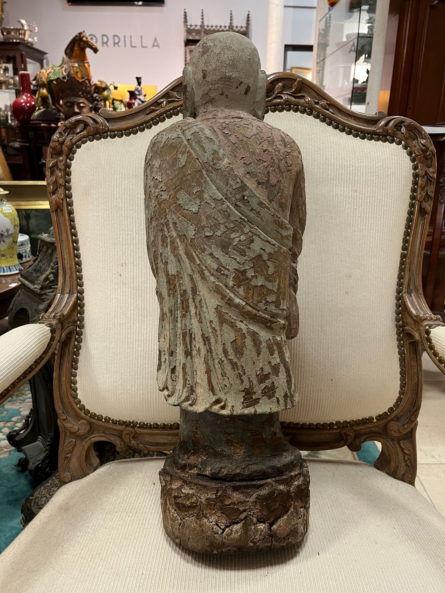 Escultura china en madera tallada, con restos de policromía. «Buda.» 59 x 17 x 16 cm.