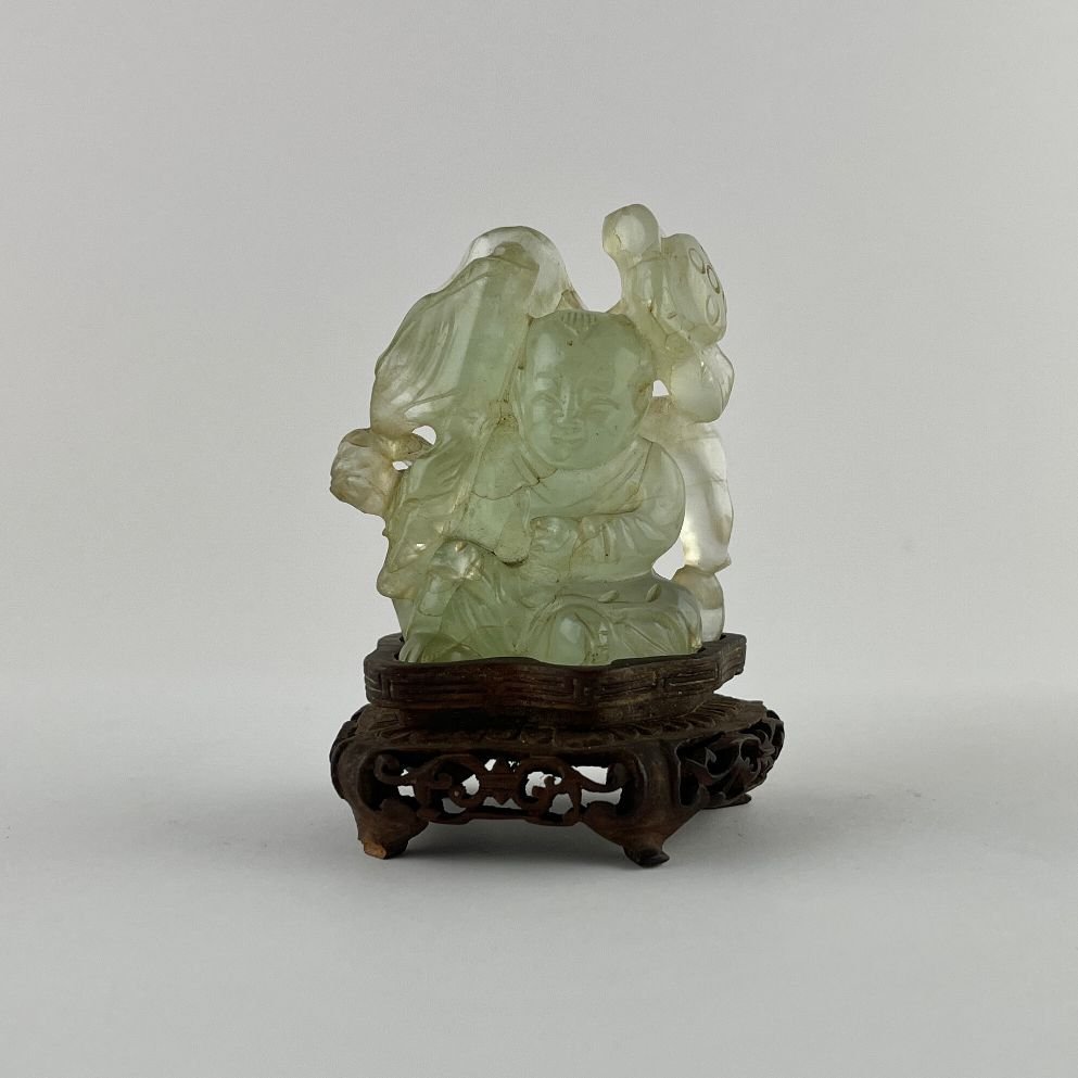 Escultura china en raíz de esmeralda tallada. «Niño con flores y estandarte.» 5.5 x 4.5 x 3 cm. Presentada sobre peana en madera tallada y calada. Alto total 8 cm.