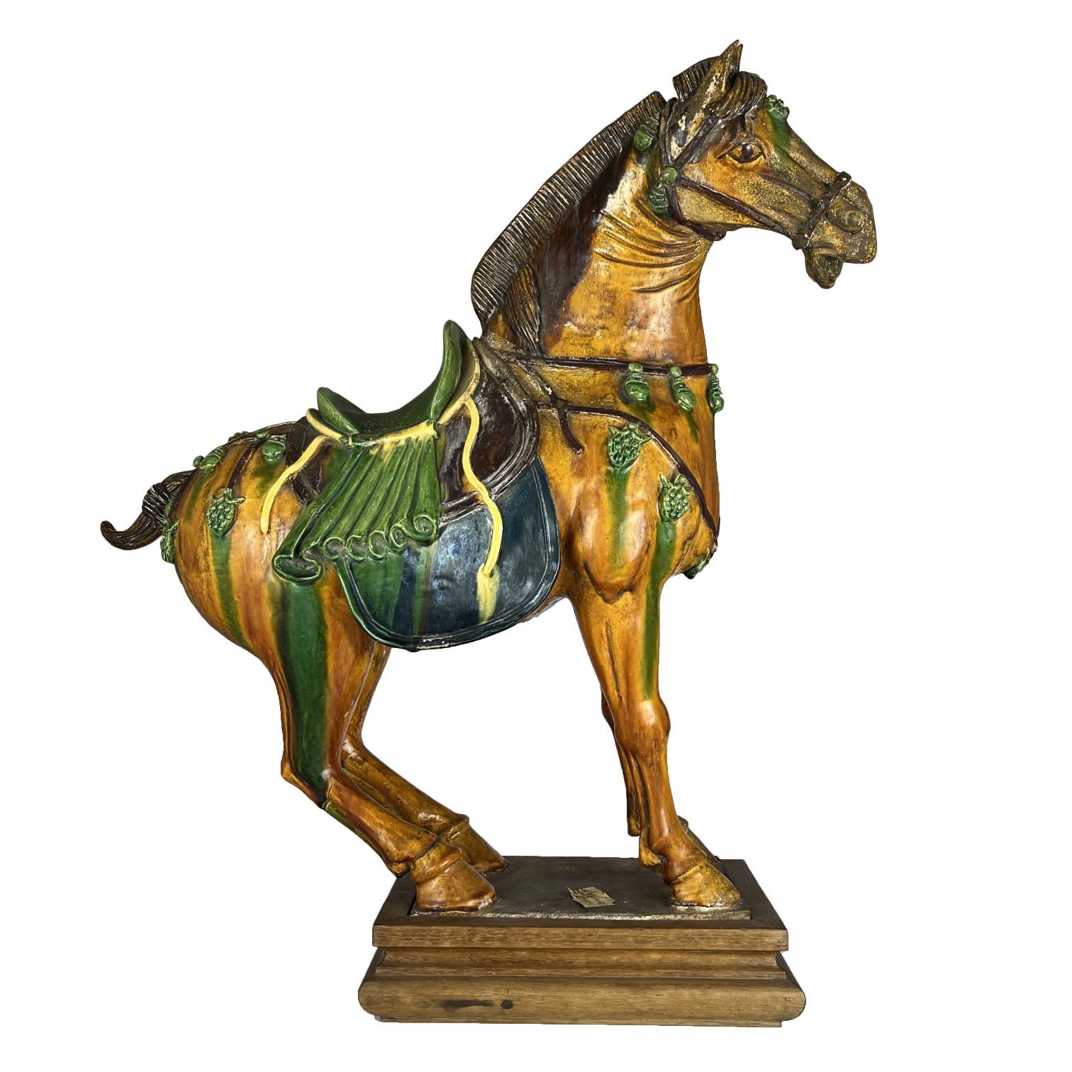 Escultura china en terracota glaseada y policromada. «Caballo.» Presentada sobre peana en madera tallada. Con antigua etiqueta en papel del inventario de Schloss Neues Palais, Potsdam. 58 x 57 x 20 cm.