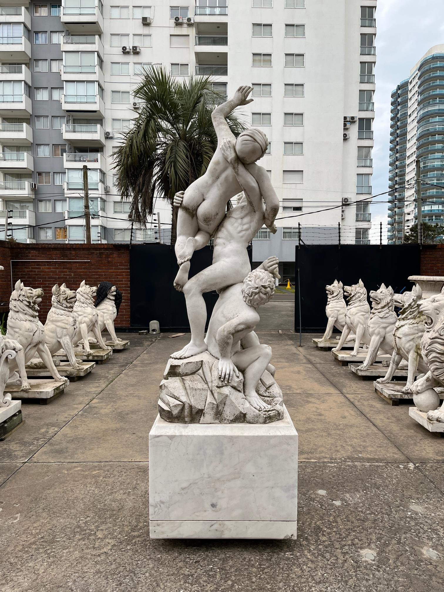 Escultura en mármol blanco veteado. «Rapto de las sabinas.» Alto 190 cm. Base 70 x 50 cm.