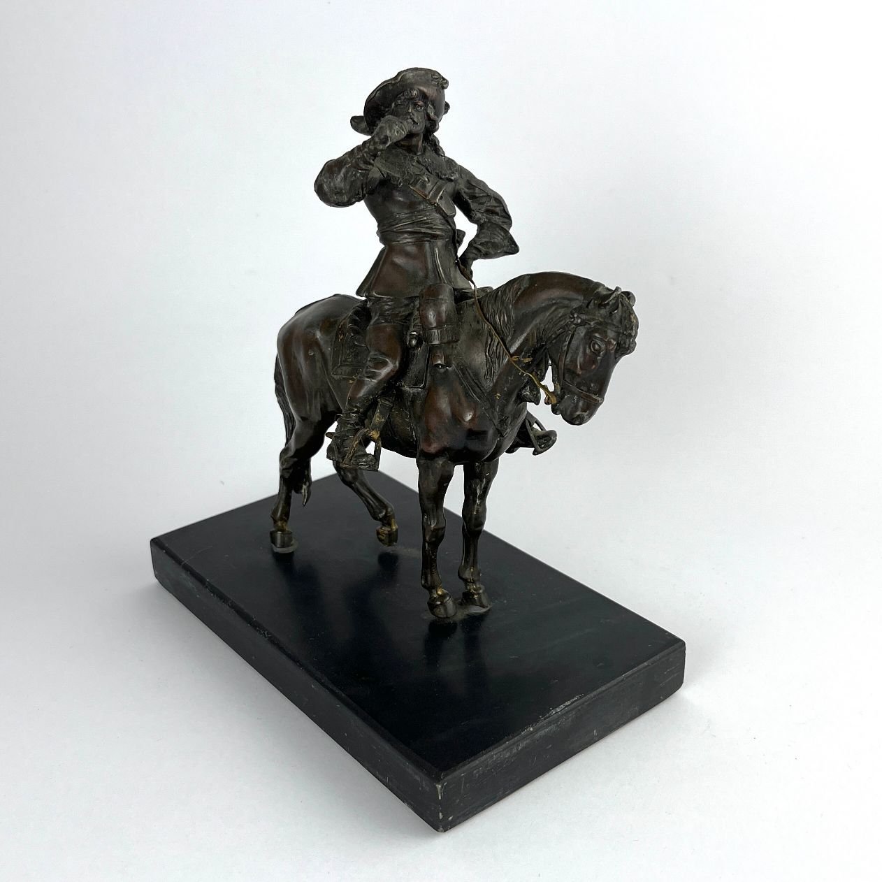 Escultura en metal pátina marrón. «Trompetero ecuestre.» 16.5 x 14 x 9 cm. Presentada sobre peana en granito negro. Alto total 19 cm.