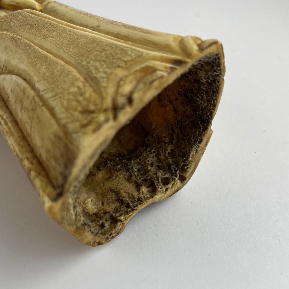 Escultura europea en hueso y madera dura tallados. «Virgen con Niño Jesús.» 25.7 x 6 cm. Presenta pequeñas averías.