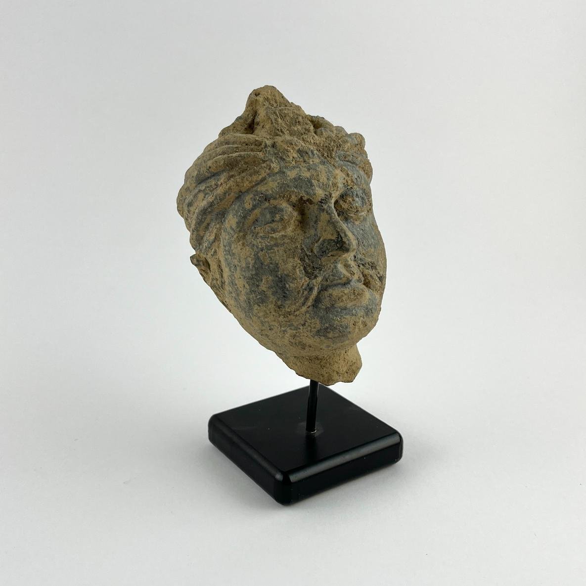 Escultura grecobudista de la región de Gandhara en esquisto tallado. «Cabeza de Bodhisattva». Siglos I a IV d.C. 8,5 x 6, 5,5 cm. Con certificado de autenticidad expedido por Artemis Gallery, Louisville, con fecha 20 de abril de 2018.