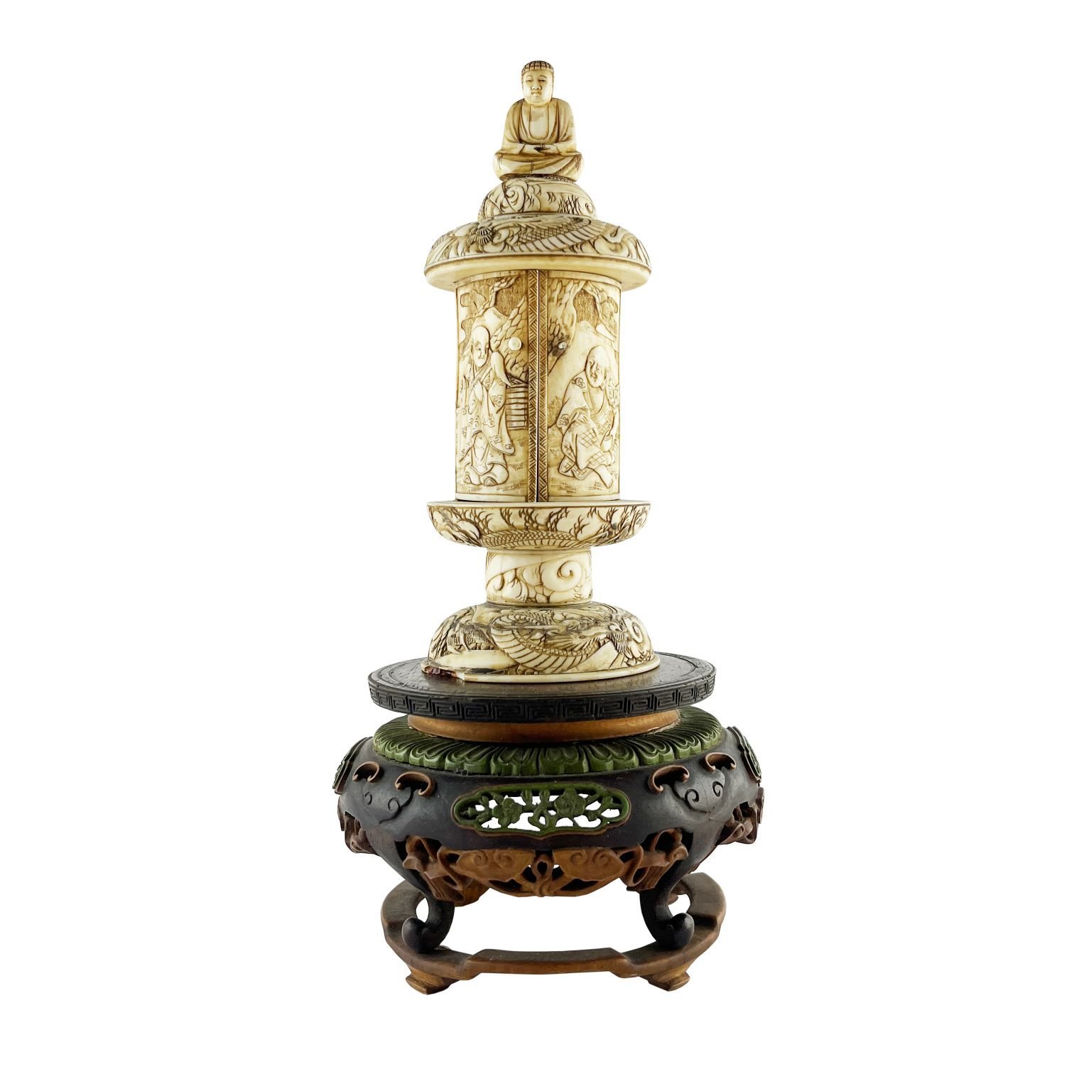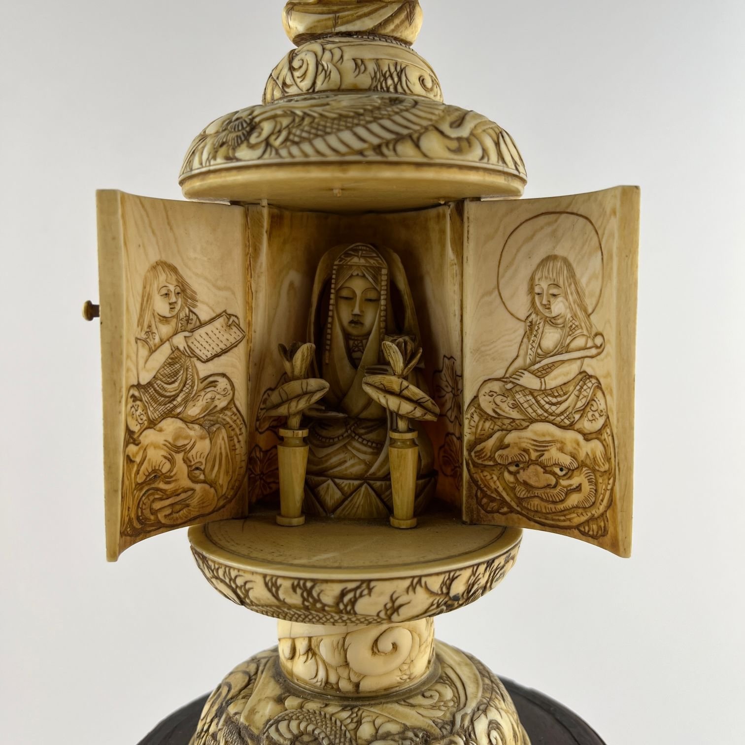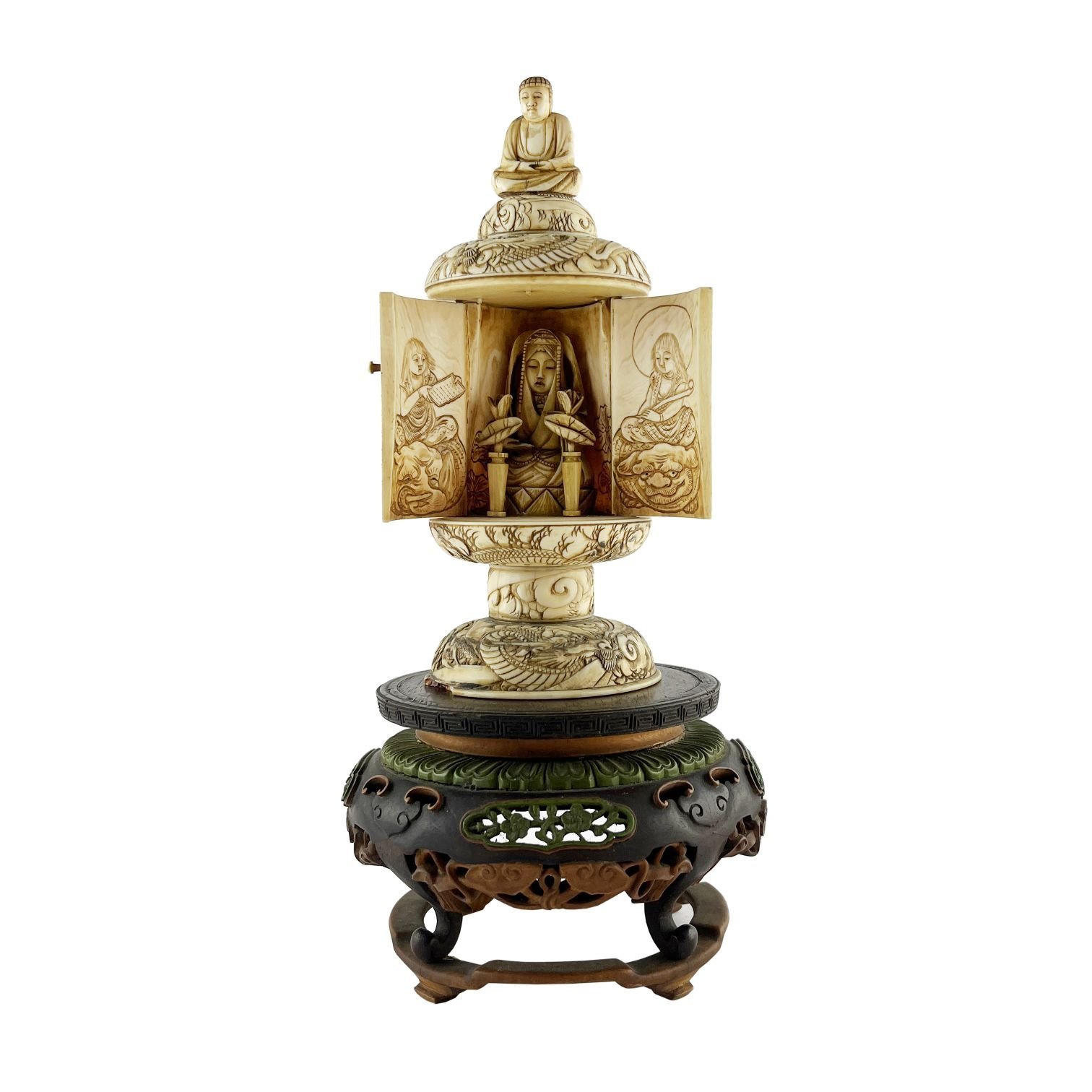 Escultura japonesa en marfil tallado. «Santuario.» Abertura frontal de dos puertas, e interior con “deidad Guanyin” tallada y «Buda sedente» en ápice. Con firma y sello en la base. Presenta restauración en base. Alto 16.5 cm. Presentado sobre peana en distintas maderas talladas y caladas, con aplicaciones en marfil teñido color verde. Alto total 24.5 cm.
