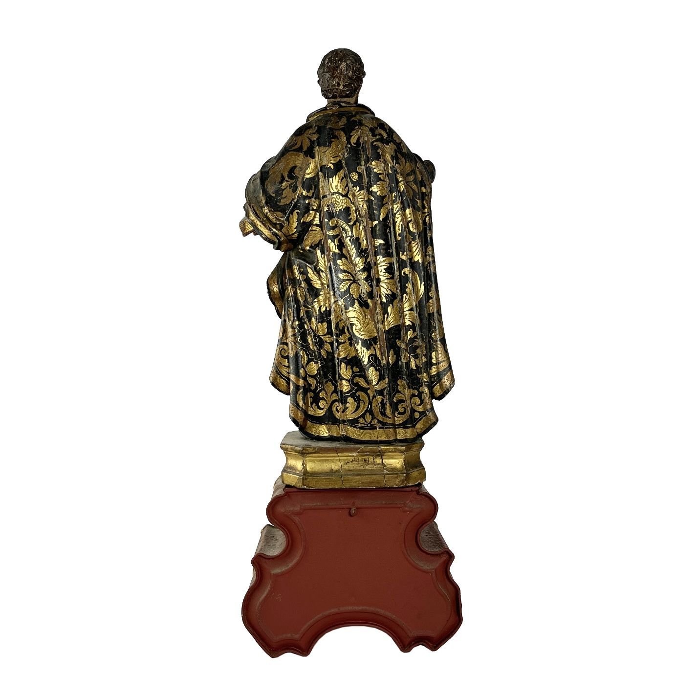 Escultura española s. XVIII en madera tallada y policromada sobre estuco. «Santo.» Alto 37 cm. Presentada sobre peana en hojalata policromada. Alto total 51 cm.