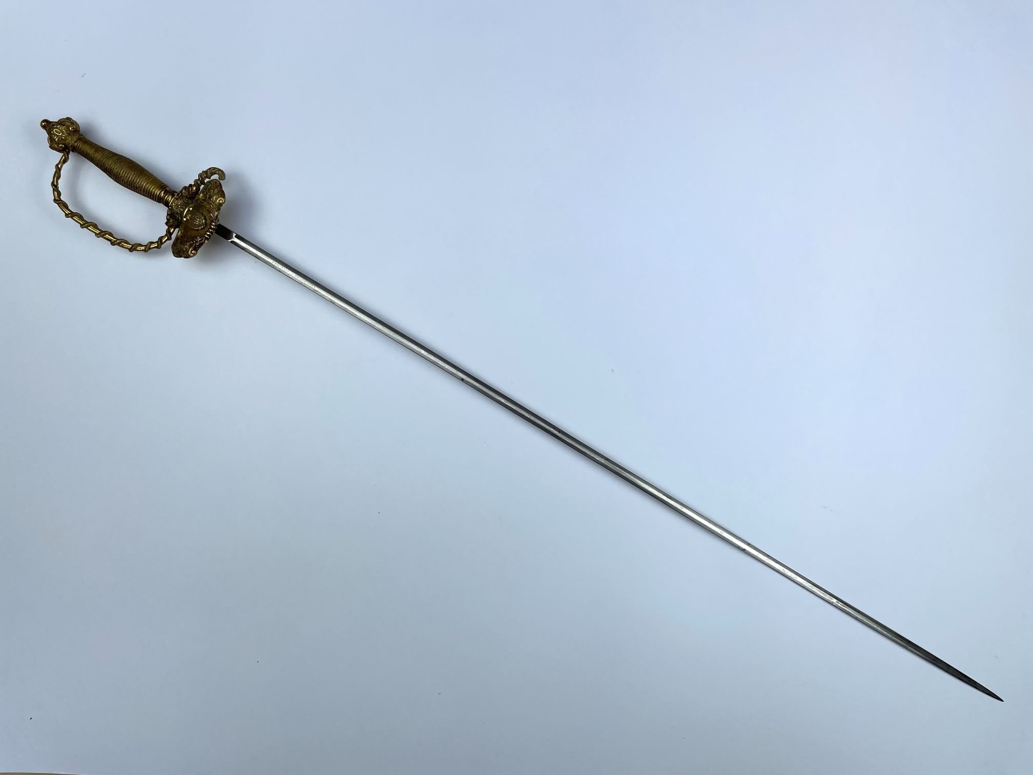 Espada de ceñir española s. XIX fabricada en Toledo. Empuñadura, guardamano y cartela en bronce cincelado y dorado al mercurio. Cartela decorada «escudo de armas del rey de España». Hoja grabada «Fab.ca de Toledo 1906», poco legible. Sin vaina.
