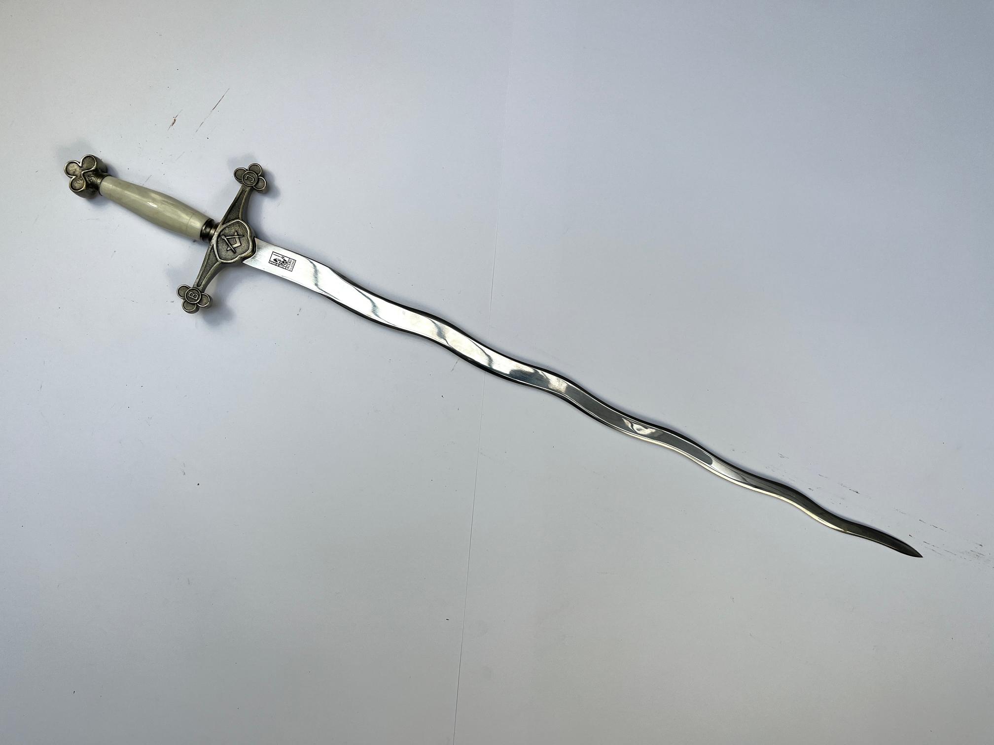 Espada masónica ceremonial de fabricación española. Hoja flamígera. Empuñadura en baquelita nacarada. Pomo y gavilán en metal decorado «simbología masónica». Largo total 77 cm.