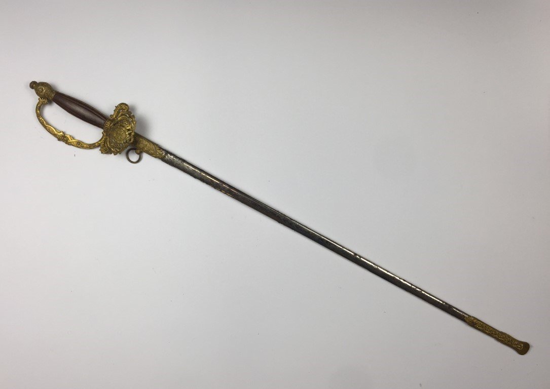 Espada uruguaya de gala. Hoja grabada al ácido «arabescos» y «motivos militares». Empuñadura con guardamano, pomo y cartela en bronce cincelado. Cachas en madera lisa. Cartela calada y cincelada «escudo de armas uruguayo antiguo». Vaina en acero niquelado con bocavaina y puntera en bronce cincelado «hojas y flores». Largo total 95 cm.