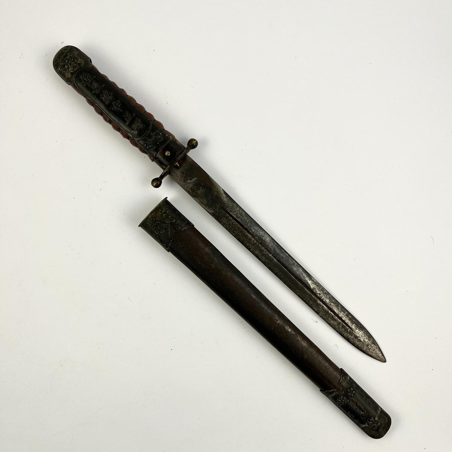 Espadín chino. Hoja tipo daga, con desangrador e inscripciones grabadas. Empuñadura forrada en cuero marrón con torzal en bronce. Montura en bronce pátina oscura cincelada “hojas, flores e inscripciones”. Vaina en metal con bocavaina y puntera en bronce decoradas “hojas y flores”. Largo total 40 cm.