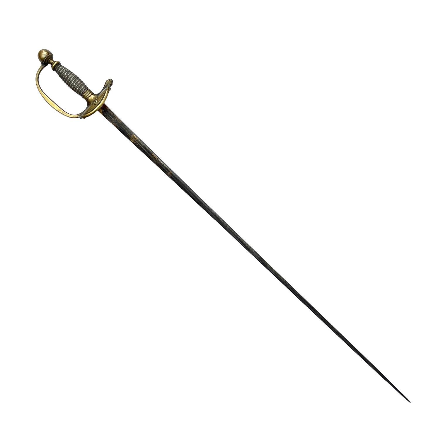 Espadín del s. XIX con guardamanos en bronce esculturado «flor de lis». Empuñadura en torzal de alambre plateado. Hoja con figuras alegóricas en oro. Sin vaina. Largo total 97 cm.