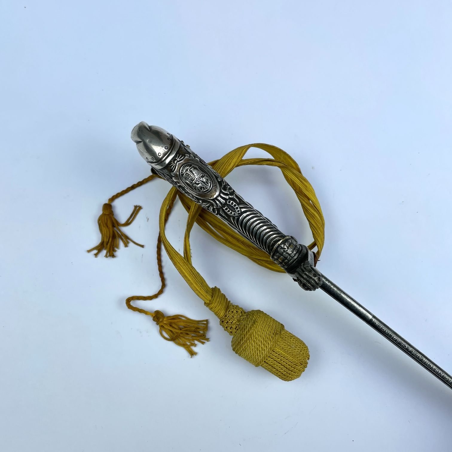 Espadín militar uruguayo fabricado por Kirschbaum. Hoja grabada al ácido «escudo de armas uruguayo antiguo» y «arabescos». Empuñadura forrada en cuero negro y metal plateado «escudo de armas uruguayo» y «casco». Sin vaina. Largo total 59 cm.