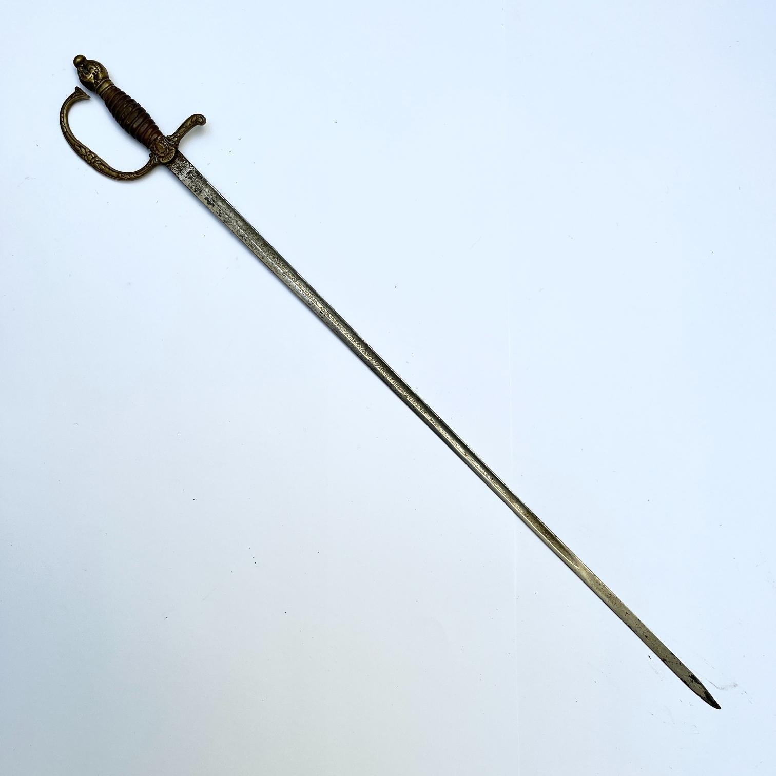 Espadín policial «gallito», Guardamanos en bronce cincelado, con avería. Empuñadura en madera gallonada. Hoja grabada al ácido, con cartela «Marina uruguaya» y nombre del importador «Esteban Botta, Montevideo». Largo 93 cm. Sin vaina.