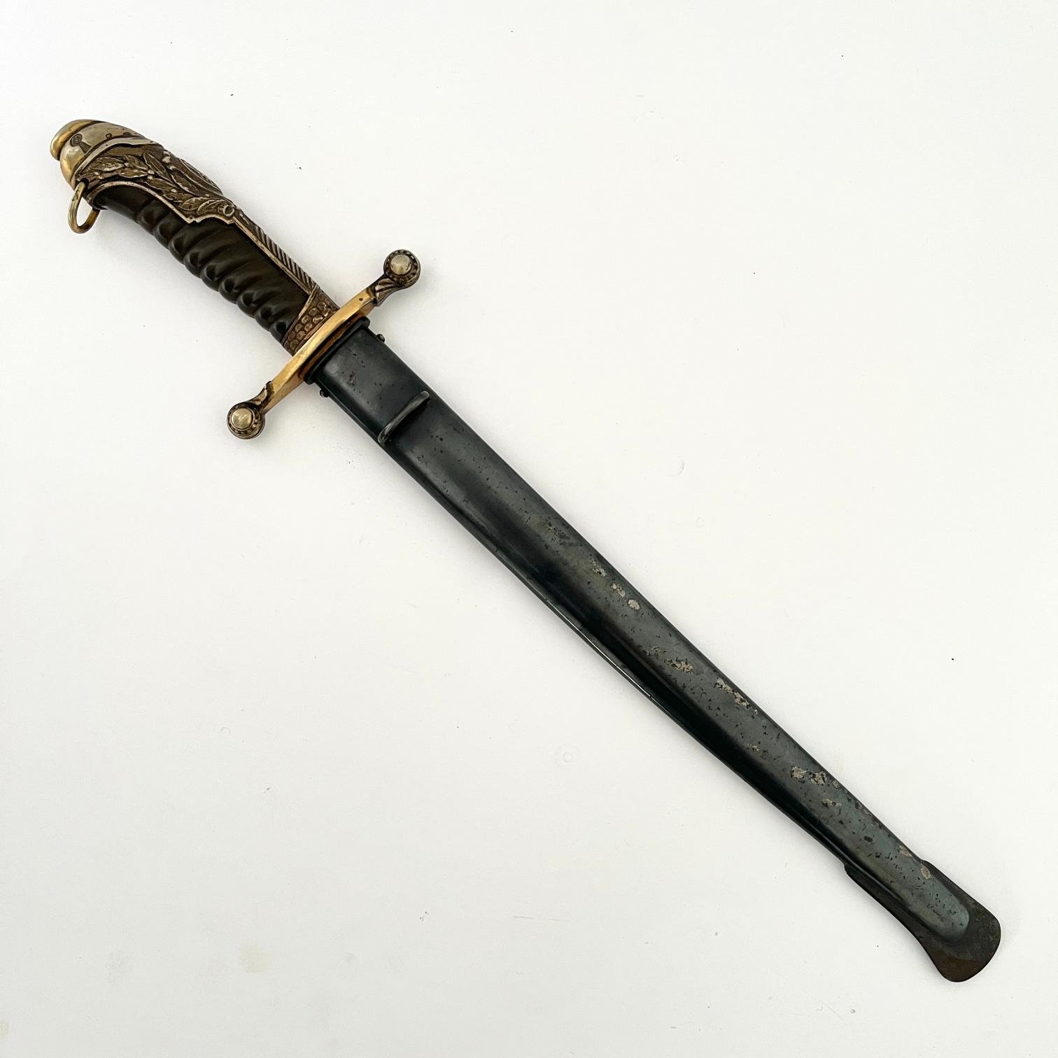 Espadín militar uruguayo. Hoja niquelada, con desangrador, grabada al ácido con inscripción «República Oriental del Uruguay». Al dorso marca del fabricante Carl Eickhorn, Solingen. Empuñadura en baquelita negra, con pomo y gavilán en metal niquelado. Pomo decorado «gorro frigio» y «escudo de armas uruguayo». Vaina en metal pavonado. Largo 49 cm. Presenta desgastes en pavón.