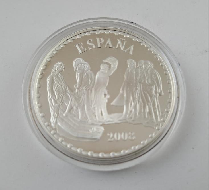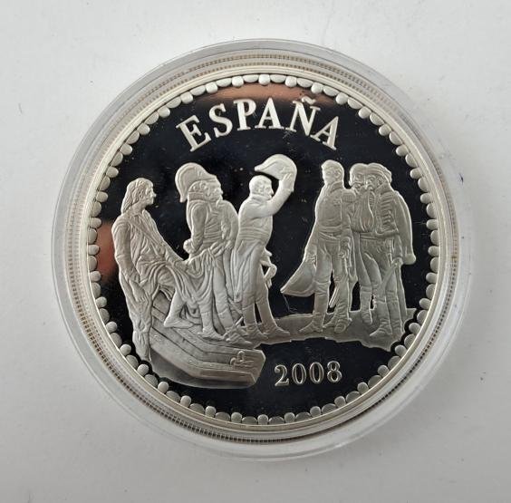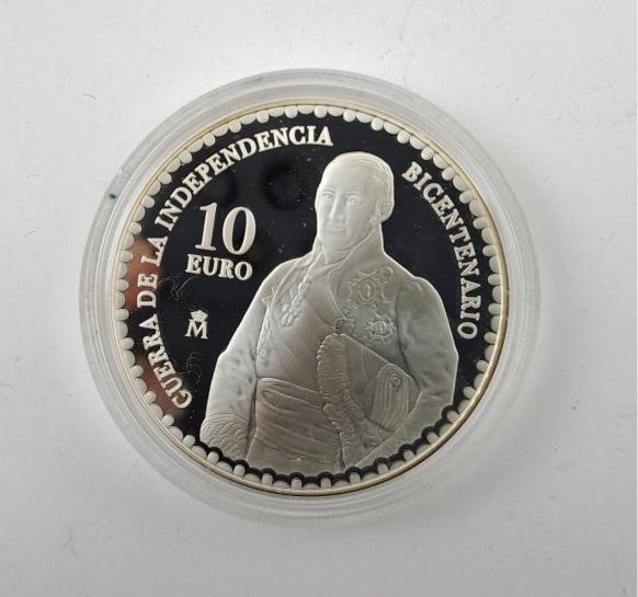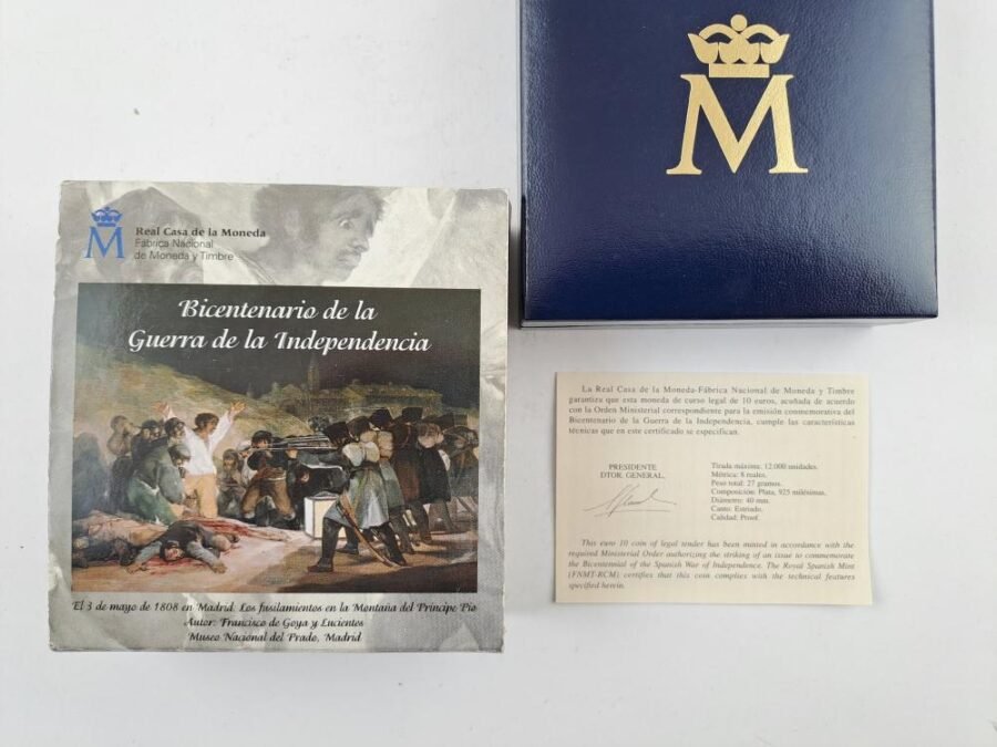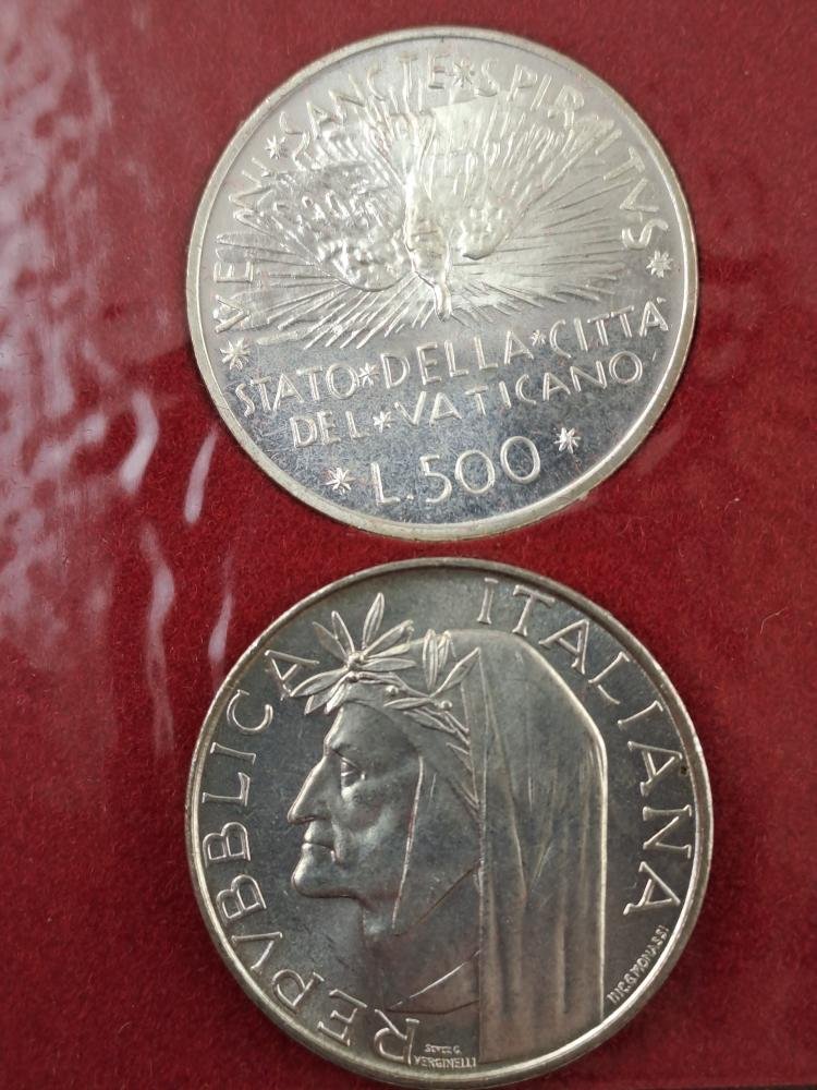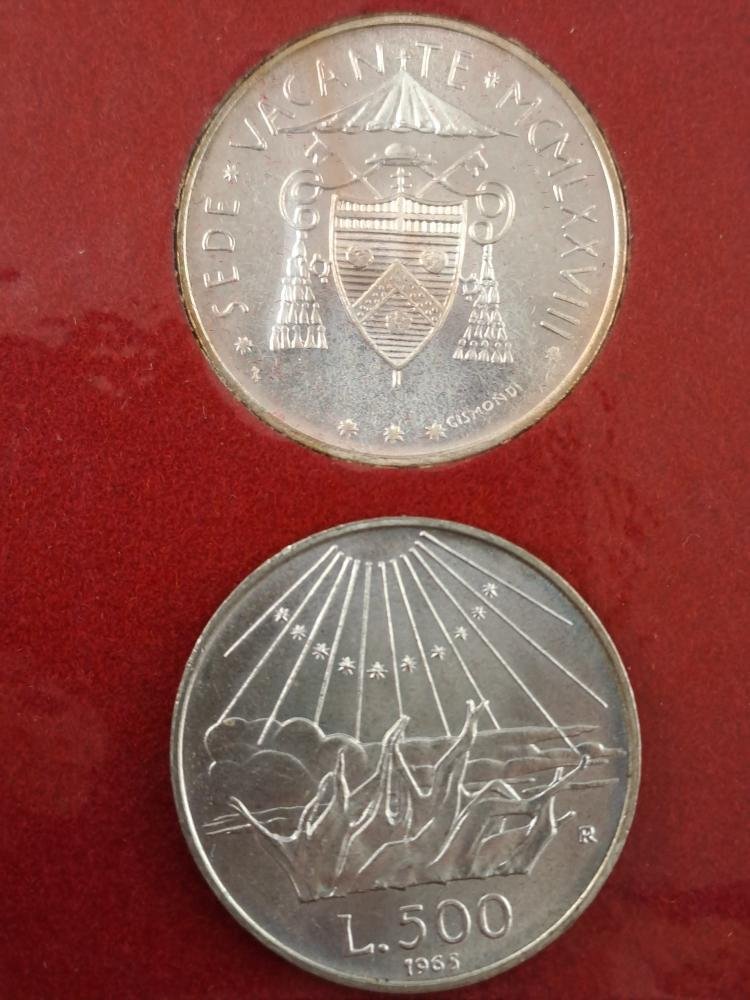 Tres monedas europeas en plata: una española “proof” en plata 925 denominación 10 euros del año 2008 conmemorativa del Gral. Castaños y los 200 años de la guerra de independencia (peso 27 gr aprox., en estuche original con certificado); una vaticana “proof” en plata 835 denominación 500 liras del año 1978 época Sede Vacante (peso 11 gr aprox.); una italiana “UNC” en plata 835 denominación 500 liras del año 1965 acuñada en conmemoración del 700 aniversario de Dante Alighieri (peso 11 gr aprox.)