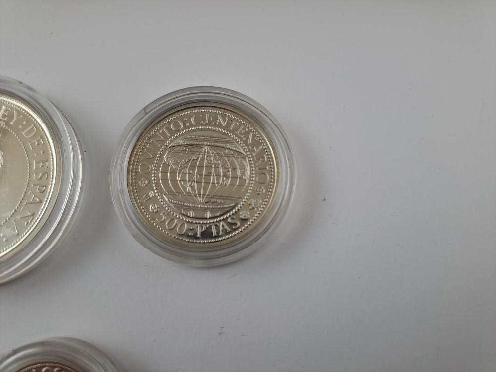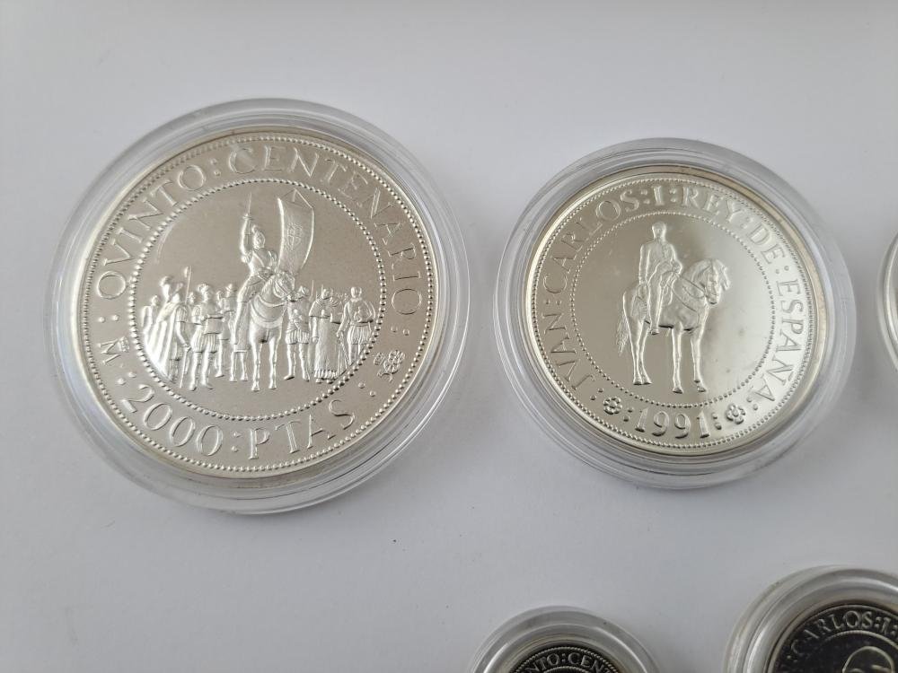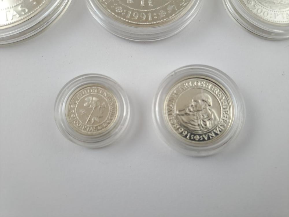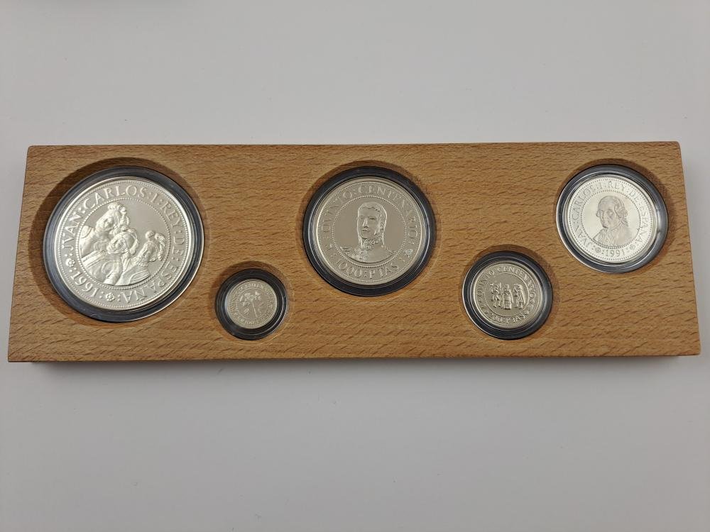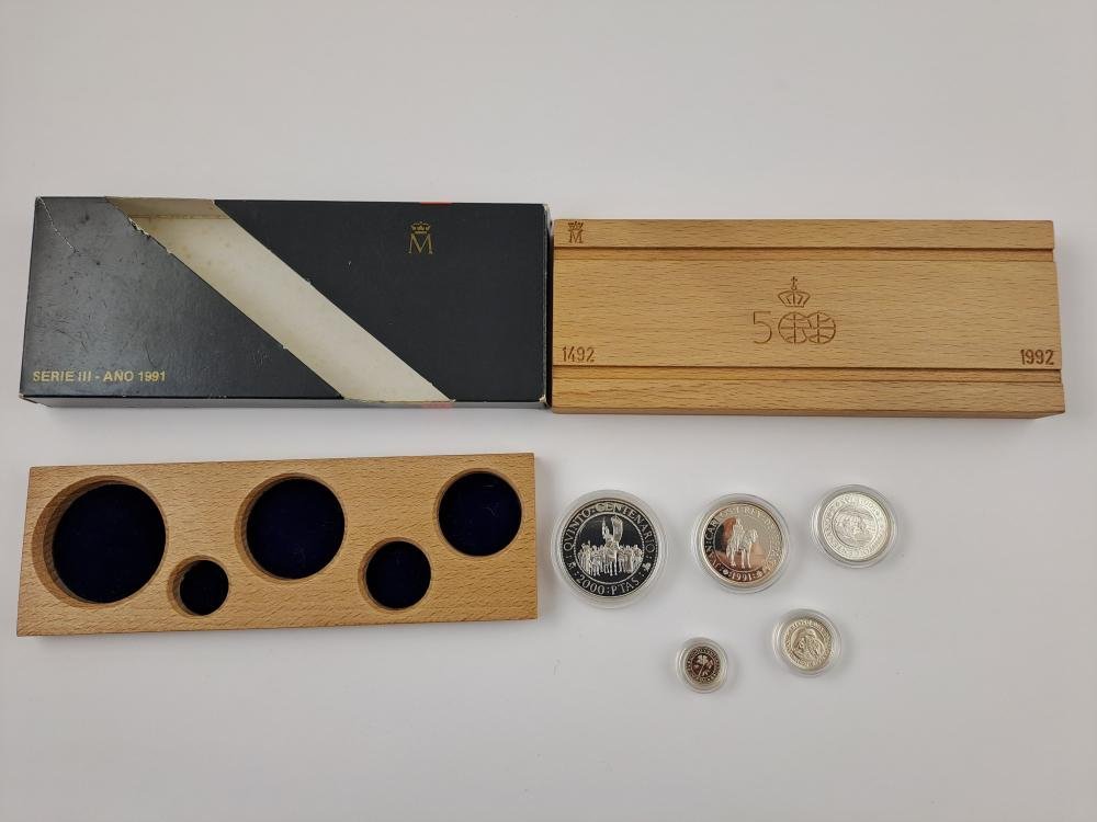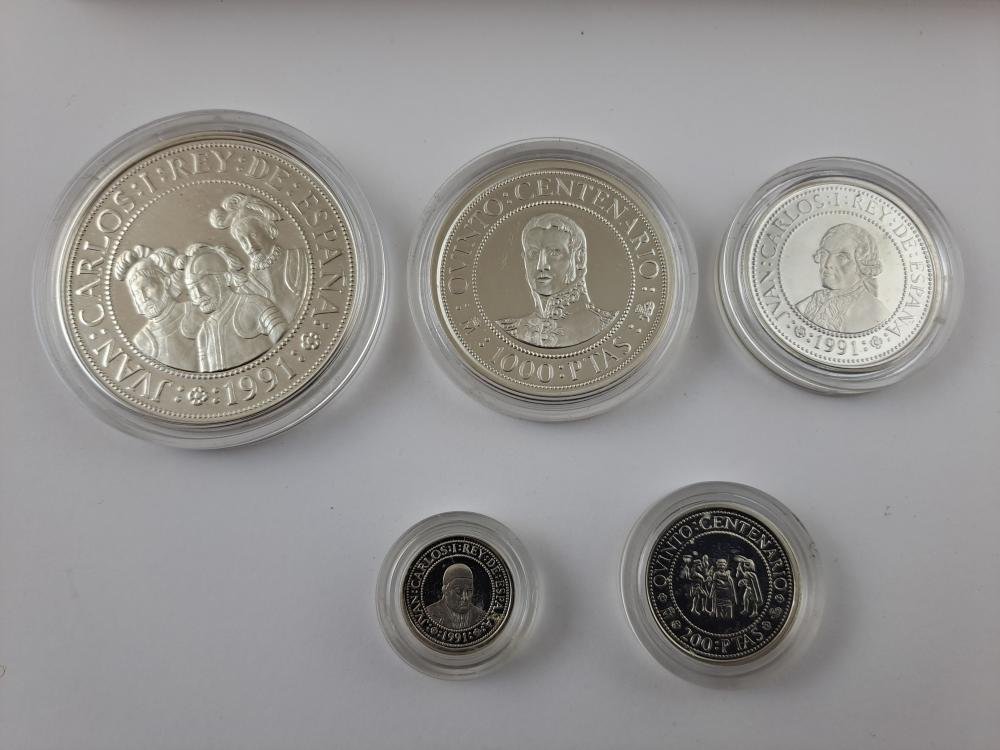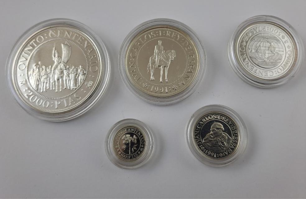 Set de cinco monedas españolas en plata 925 conmemorativas del 500 aniversario del Descubrimiento de América, serie III, denominaciones 100, 200, 500, 1000 y 2000 pesetas del año 1991. Encapsuladas, en estuche de madera y caja de cartón originales de la Fábrica Nacional de Moneda y Timbre.