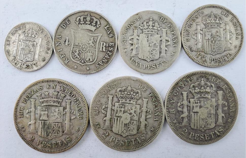 Siete monedas españolas en plata. Tres de ellas en plata 835 denominaciones 2 pesetas del año 1869, 1879, 1882 (año estrella borrado), de un peso de 10 gr aprox. cada una; otras dos en plata 835 denominaciones 1 peseta de los años 1883 y 1904, de un peso de 5 gr aprox. cada una; otra en plata 900 denominación 4 reales del año 1854, de un peso de 5,26 gr aprox., otra en plata 835 denominación 50 centésimos del año 1880, de un peso de 2,5 gr.