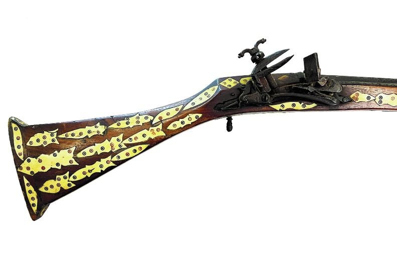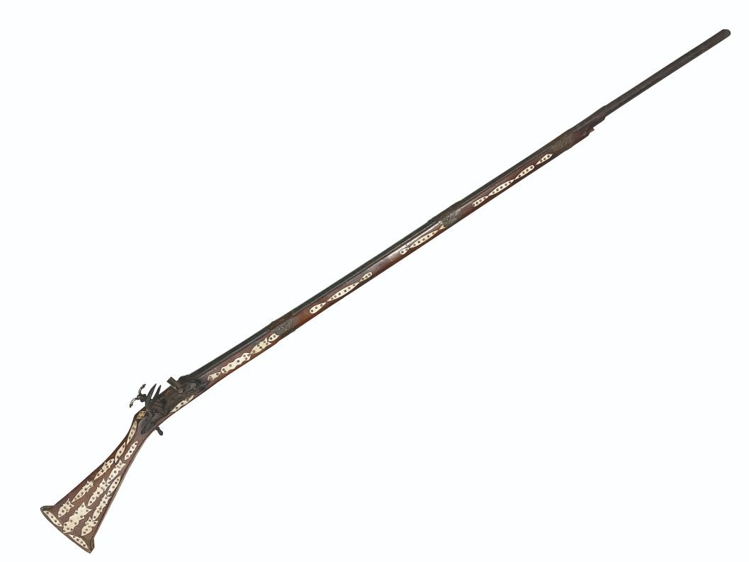 Espingarda de avancarga sistema a pedernal o de chispa. Caño hexagonal con incrustaciones en metal «arabescos». Culata en madera con aplicaciones en hueso tallado y policromado. Abrazaderas en cobre repujado. Llave tipo miguelete, con seguro. No funciona. Largo total 185 cm.