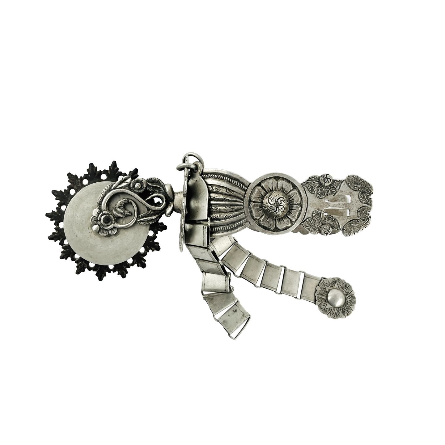 Espuela nazarena rioplatense s. XIX en plata cincelada «hojas y flores». Pigüelo calado y esculturado «víbora, hojas y flores». Rodaja en hierro forjado. Alzaprimas en eslabones de plata. Largo total 26 cm.