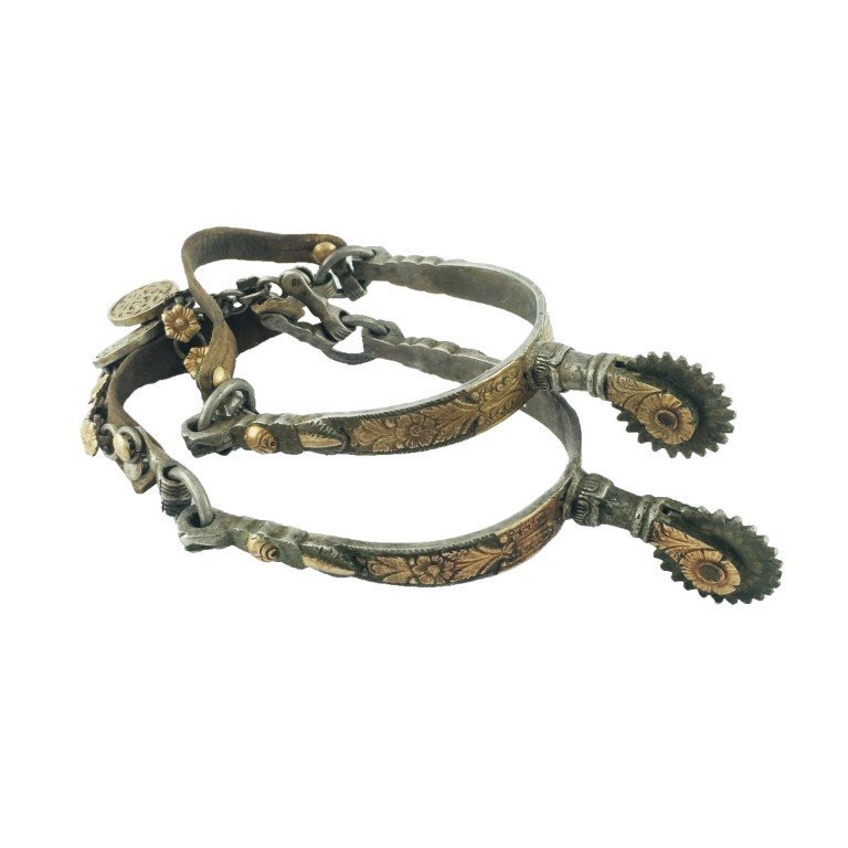 Par de espuelas en plata y oro cinceladas «hojas y flores». Rodajas en plata. Alzaprimas en eslabones de plata, con flores en oro y escudo con iniciales «S.M.C.»