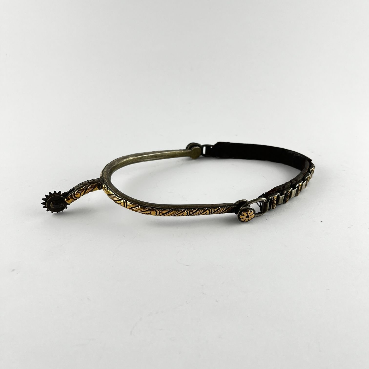 Espuelín en oro y plata cincelados «flores» con rodaja en hierro forjado y alzaprima en eslabones de plata y oro.