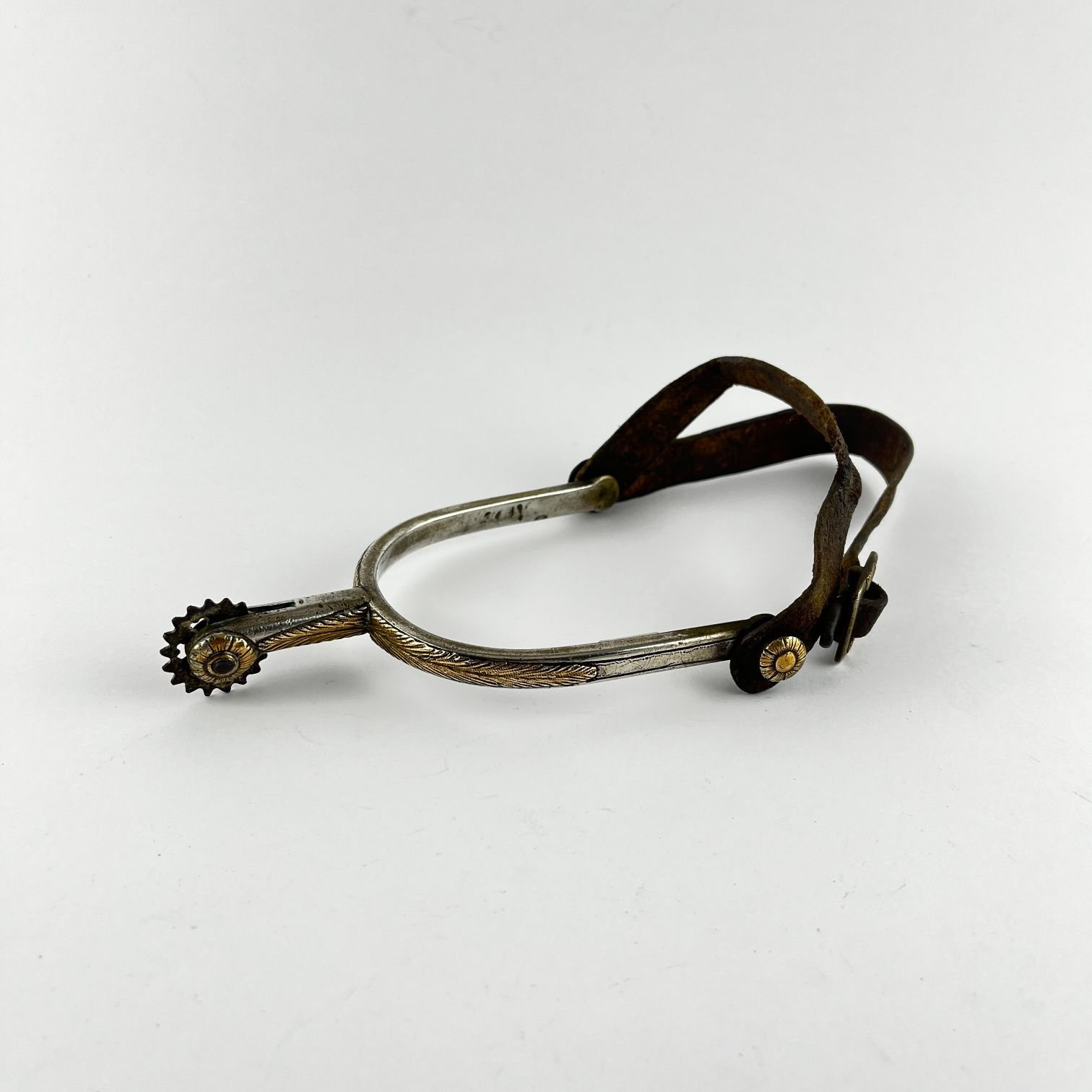 Espuelín en plata y oro cincelado «hojas» con rodaja en hierro forjado y alzaprima en cuero con hebilla en plata y oro.