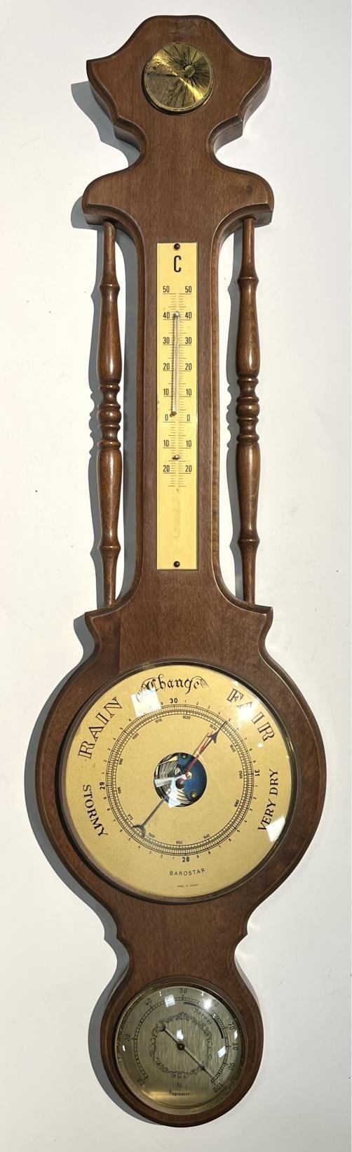 Estación meteorológica francesa en caoba, con barómetro, higrómetro y termómetro. Alto 184 cm. Termómetro averiado.
