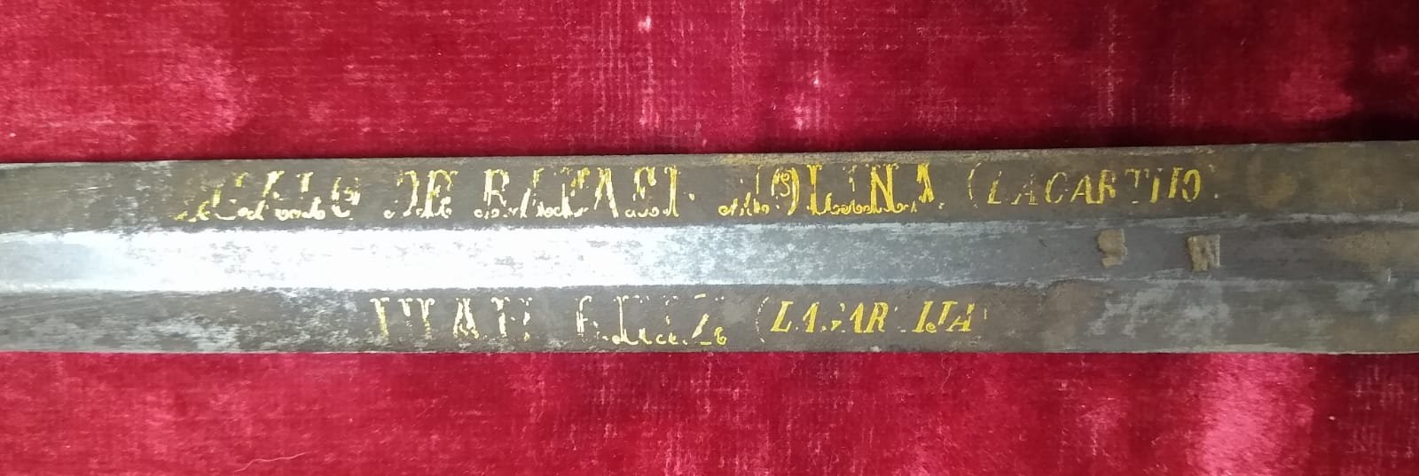 Histórico estoque español de torero, siglo XIX. Hoja de seis caras, con leyendas incrustadas en oro “Regalo de Rafael Molina (Lagartijo)” (Córdoba, España, 1841-1900) a “Juan Ruiz (Lagartija)” (Murcia, España, 1855-1926). Empuñadura en hierro forjado forrada en cinta de lana roja, con restos de gamuza en forro de pomo. Marcajes del fabricante “M.S.”. Largo total 90 cm.