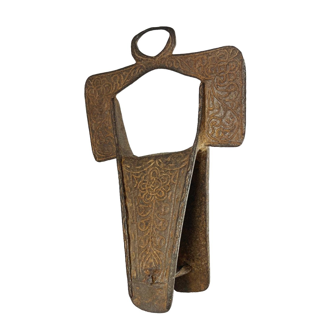 Estribo de cruz mexicano s. XVII-XVIII en hierro forjado y cincelado «hojas y flores». Alto 32 cm. Completo, sin mutilar. De origen árabe, los estribos de cruz fueron importados a Nuevo México y más tarde prohibidos, al asemejarse en forma a la cruz de Cristo, lo que motivó que muchos de ellos fueran recortados. Proveniencia: colección Familia von Buch, Argentina.
