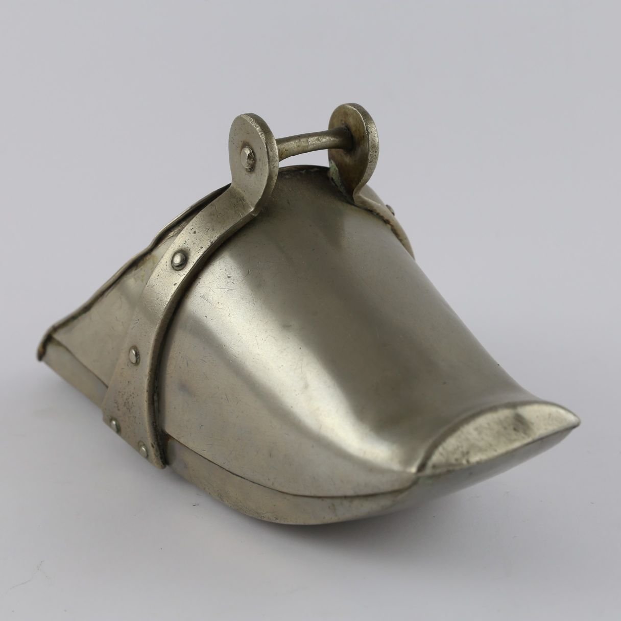 Estribo tipo zapato en metal blanco. Largo 22 cm. Pequeñas averías.