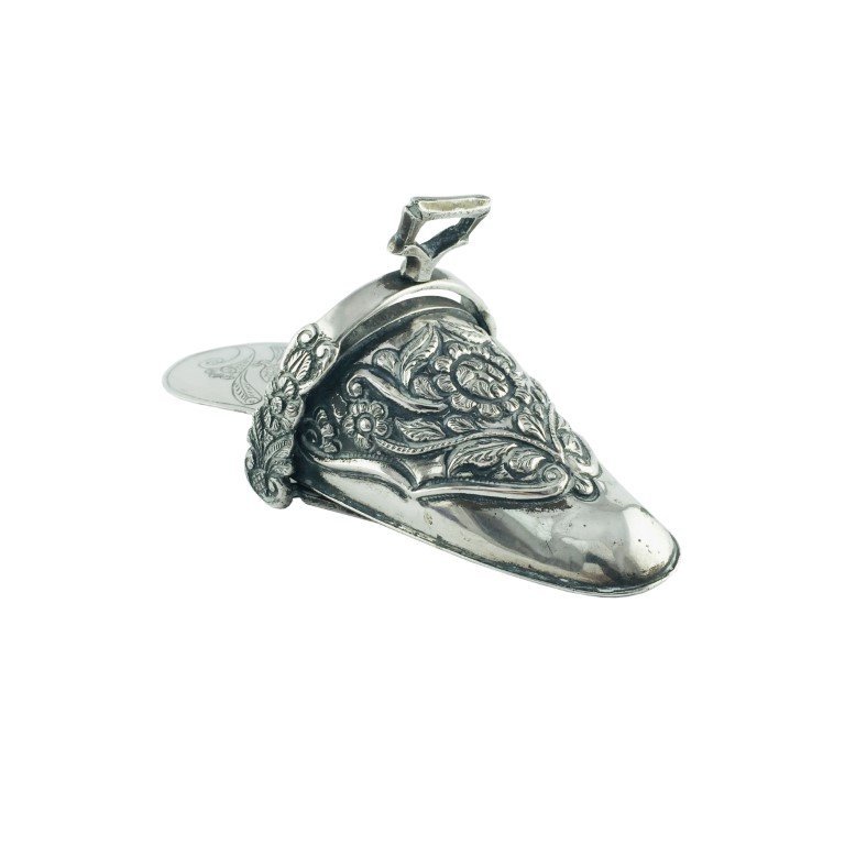 Estribo hispanoamericano s. XIX para dama, tipo zapato, en plata cincelada «hojas, flores y ave». 9 x 21 x 9 cm. Peso 335 gr.