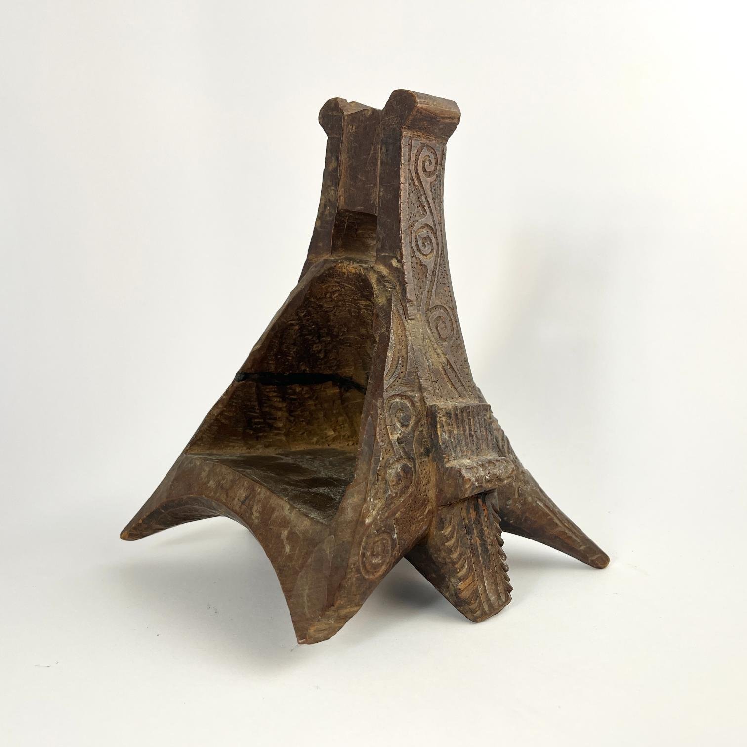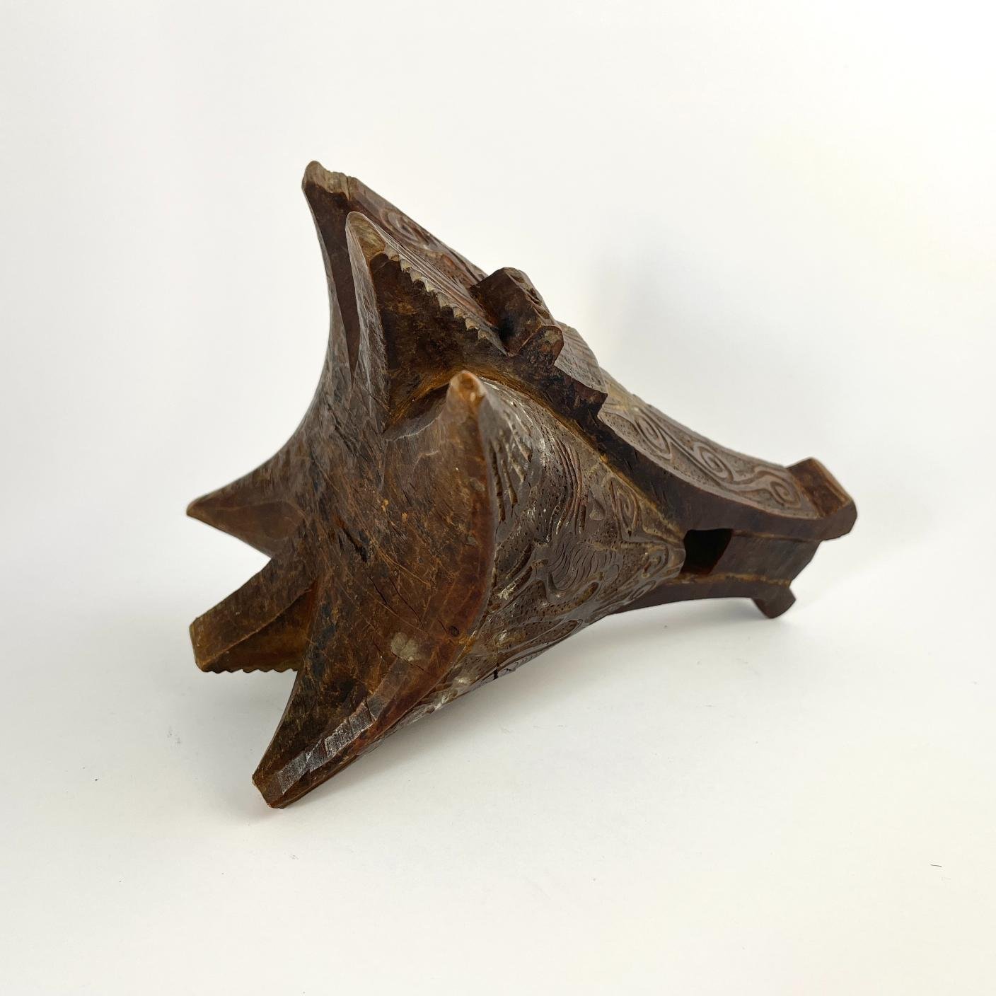 Estribo peruano s. XIX en madera tallada y cincelada «aves» y «guarda geométrica». Alto 20 cm. Presenta pequeño faltante. Proveniencia: colección Familia von Buch, Argentina.