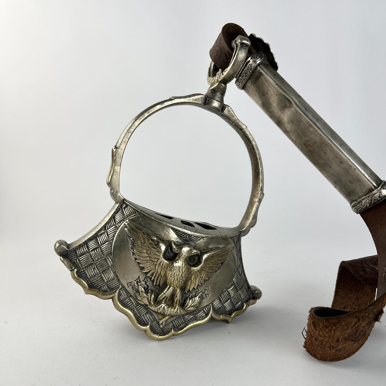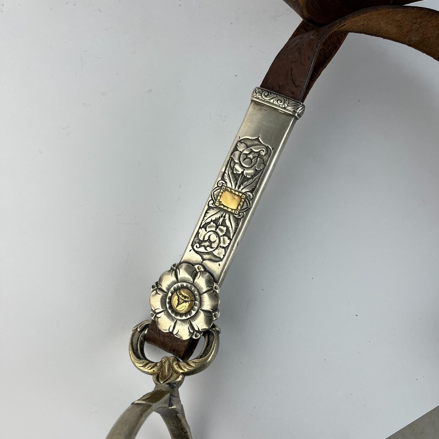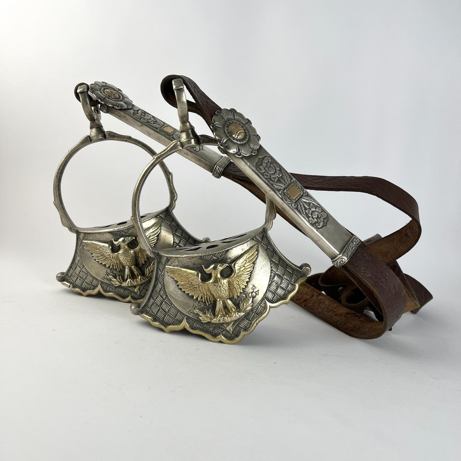 Par de estribos tipo campana en metal estampado «águilas» con detalles en dorado, con estriberas en suela marrón y pasadores chatos en plata y oro cincelados «hojas y flores».