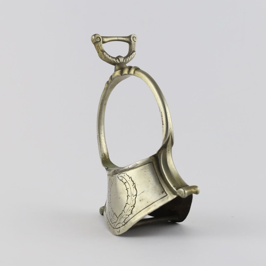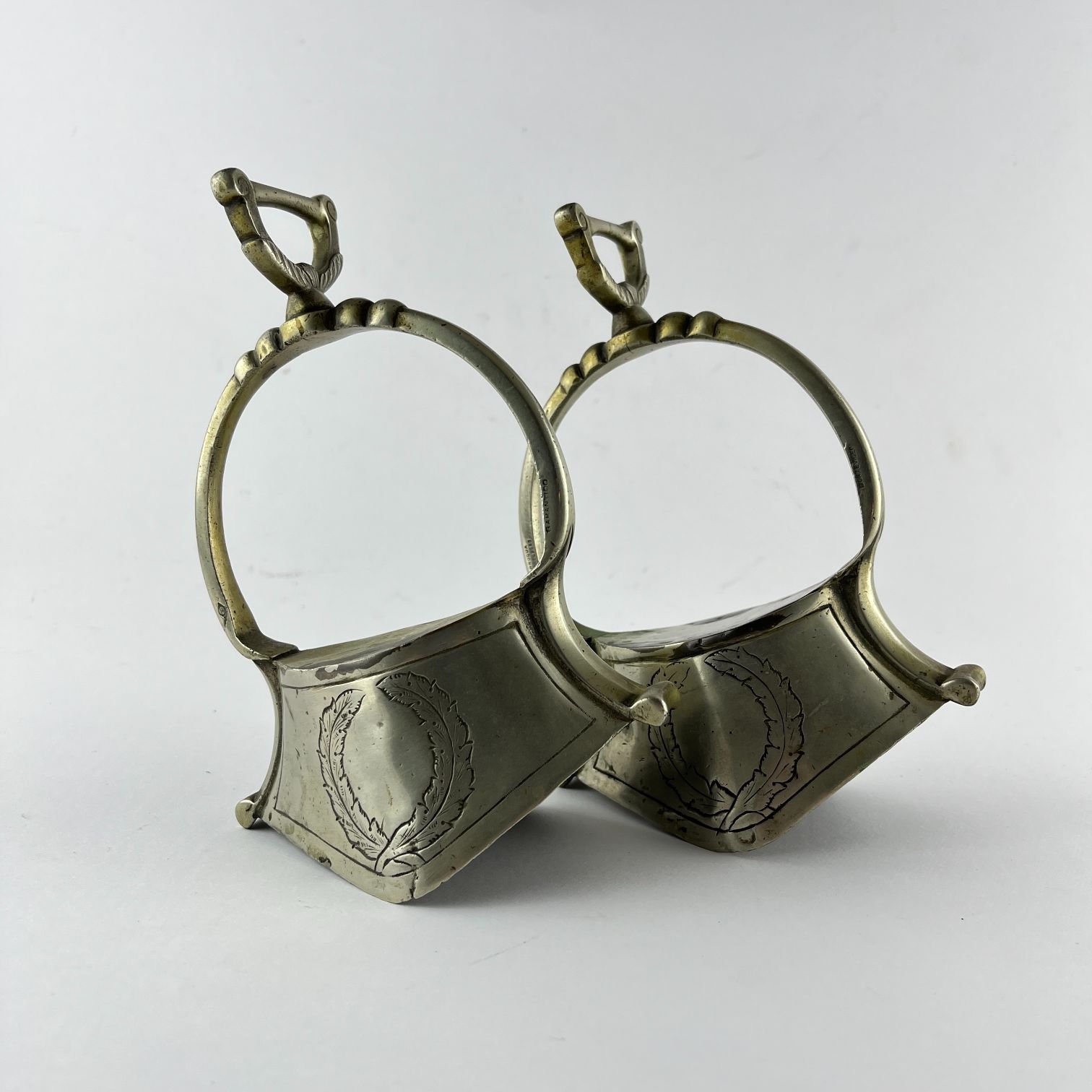 Par de estribos tipo campana en metal “Sol” de Broqua & Scholberg, Montevideo, decorados «hojas».