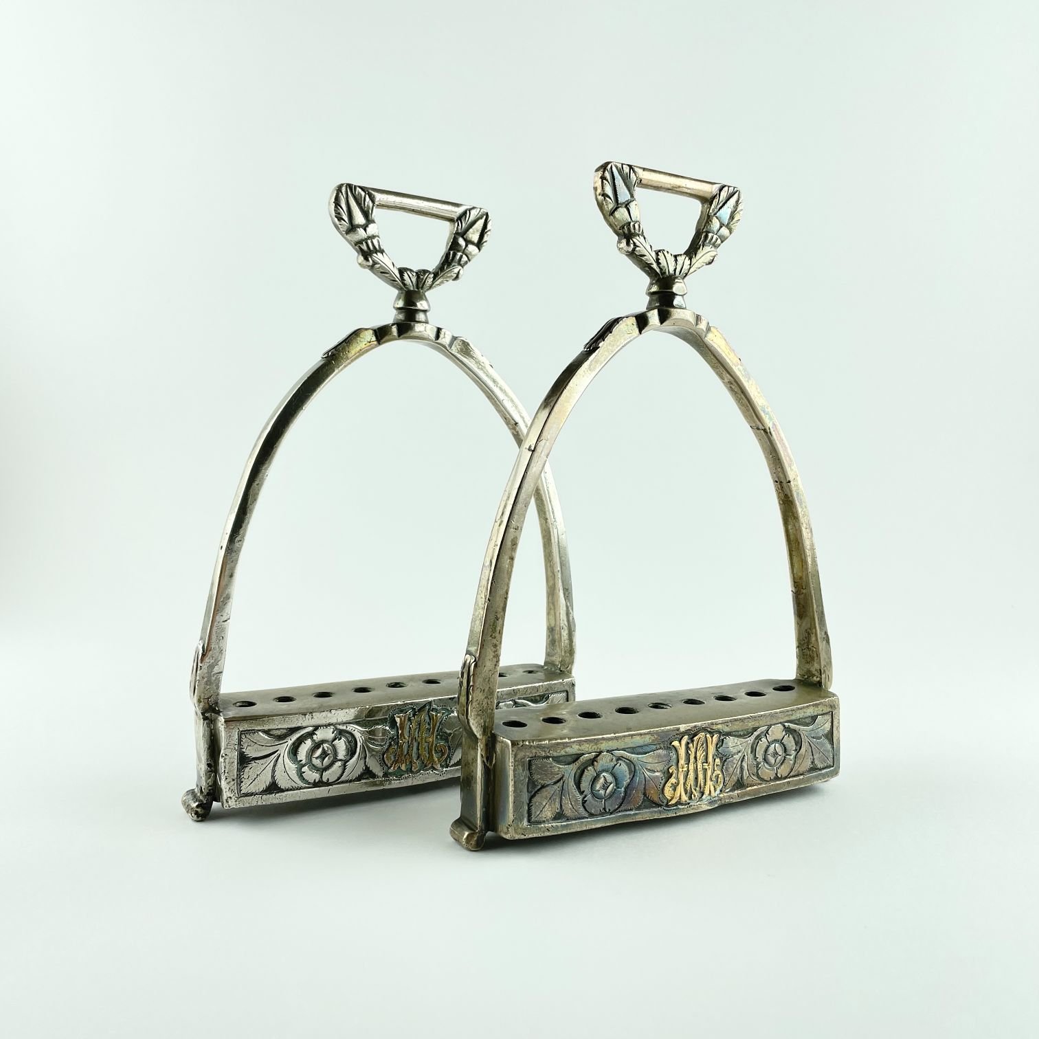 Par de estribos en plata cincelada «hojas y flores» con iniciales «H.A.» grabadas en oro.