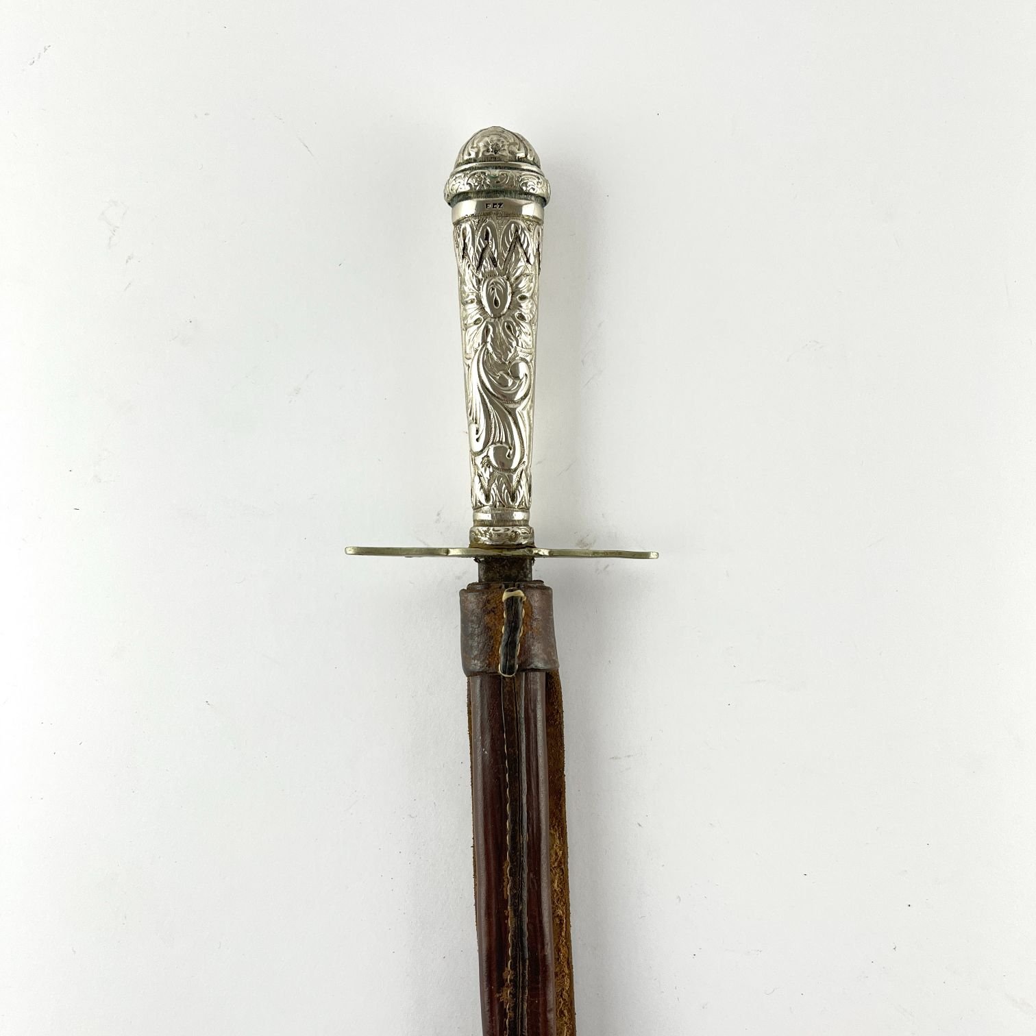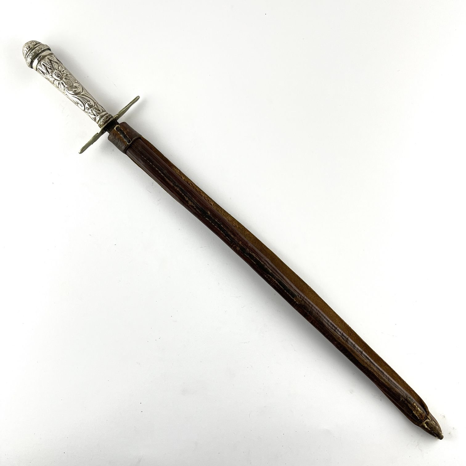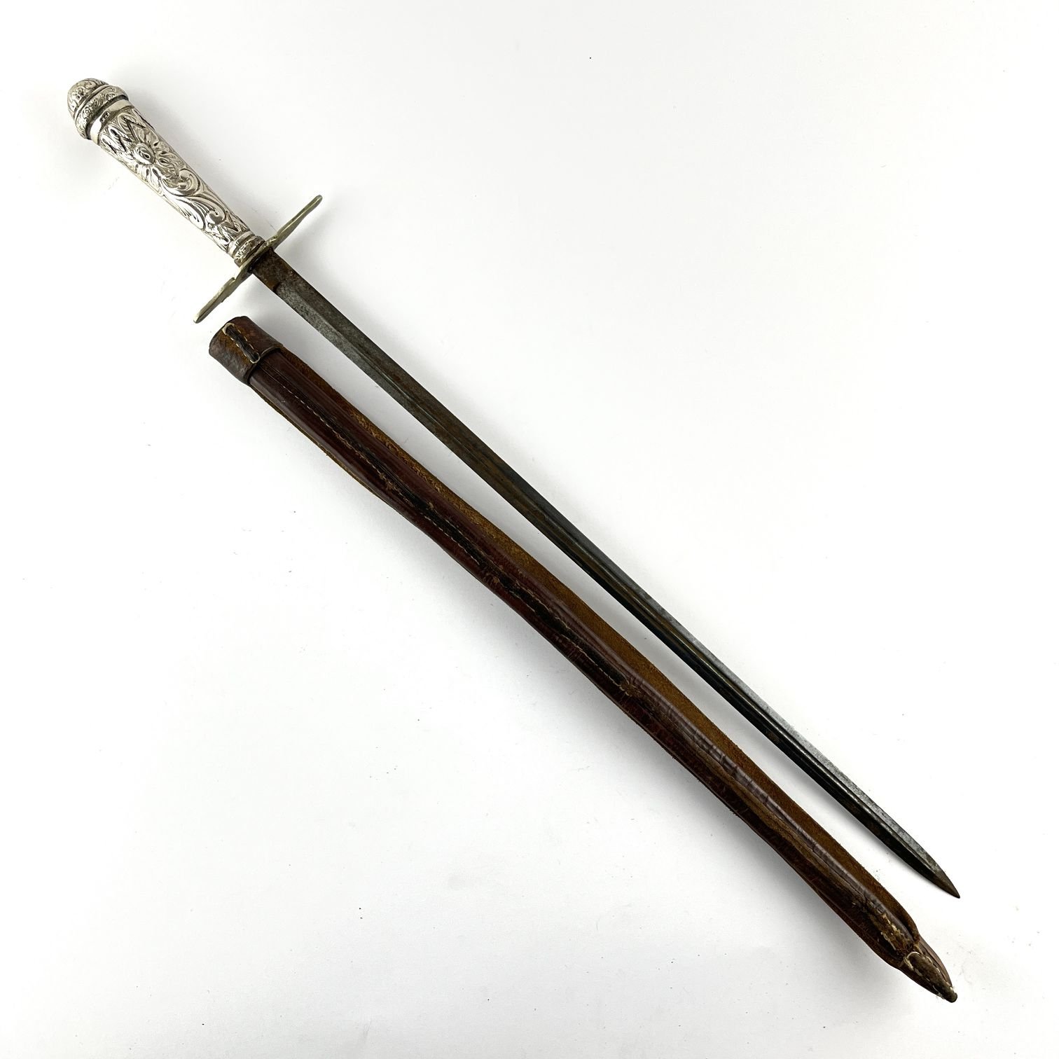 Facón caronero. Hoja de cuatro filos. Cabo en plata cincelado «hojas y flores». Largo 60 cm. Vaina en cuero marrón.