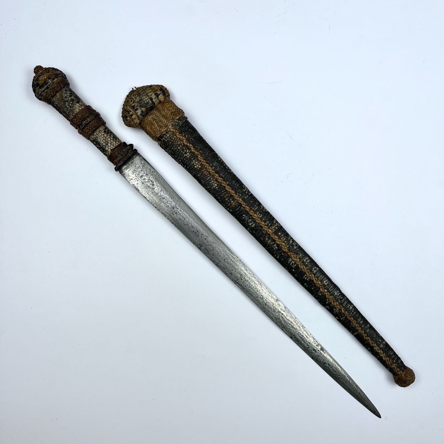 Facón caronero. Cabo y vaina forradas en cuero de lagarto, con detalles en fino cuero trenzado. Largo 53 cm.