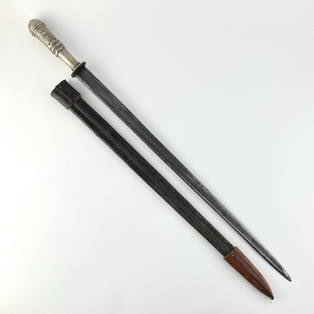 Facón caronero uruguayo. Hoja de sable «Sol» de Broqua & Scholberg, Montevideo. Cabo en plata cincelado «hojas y flores». Gavilán redondo en plata lisa. Largo total 70 cm. Vaina en cuero negro.