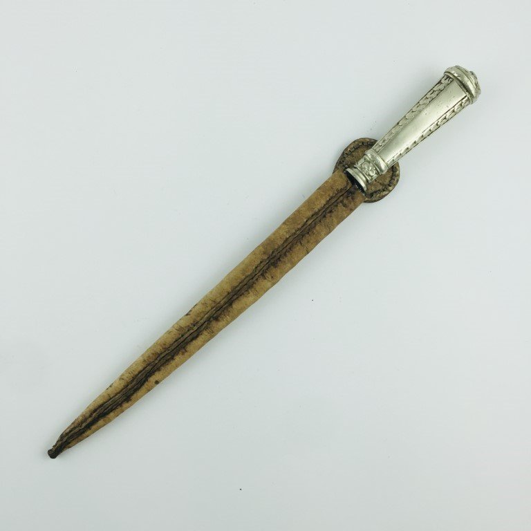 Facón caronero. Hoja de sable, con desangrador. Cabo en metal blanco estampado. Largo total 39 cm. Vaina en cuero crudo.