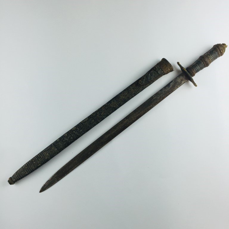 Facón caronero. Cabo y vaina forrados en piel de lagarto, decorados con fino cuero trenzado. Gavilán en bronce. Largo total 61 cm.