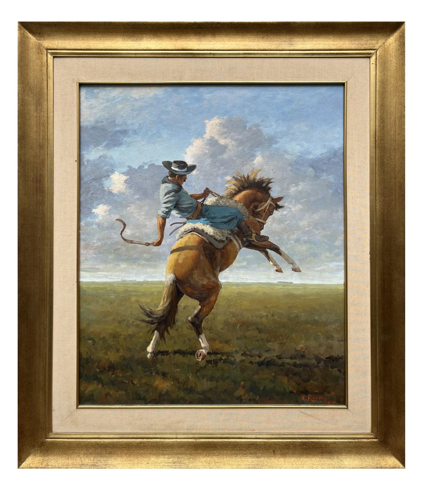 FEDERICO REILLY (escuela uruguaya, 1922-2012). Óleo sobre tela. «Jineteada.» Firmado y fechado «87» abajo a la derecha. 65 x 54 cm.
