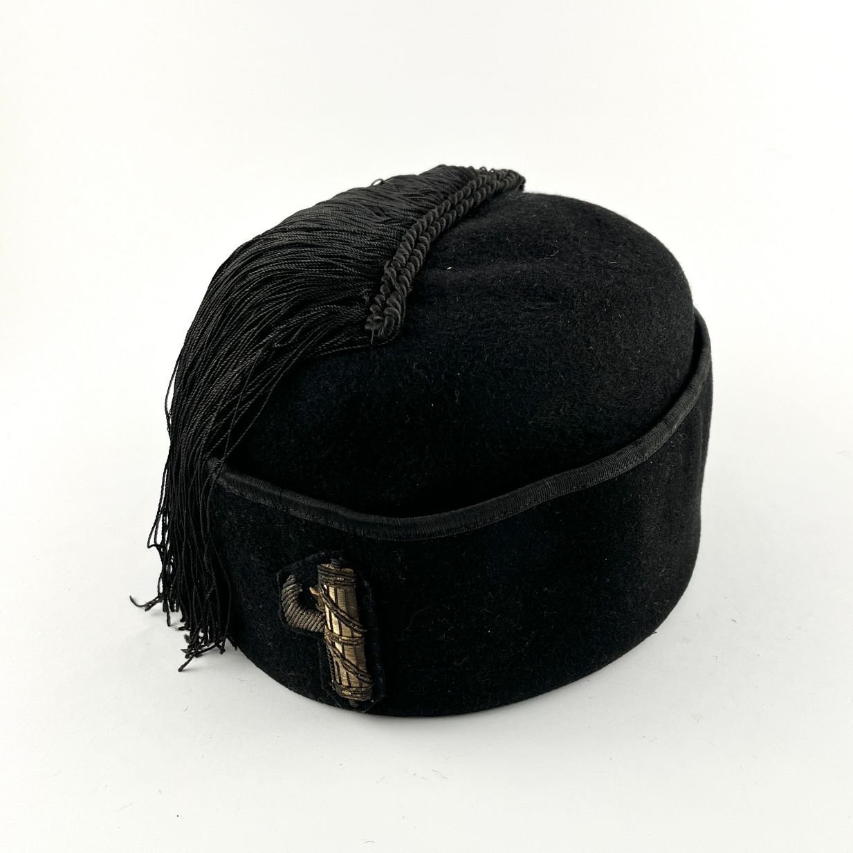 Fez italiano en paño negro con «fascio littorio» frontal bordado en filigrana plateada y dorada.