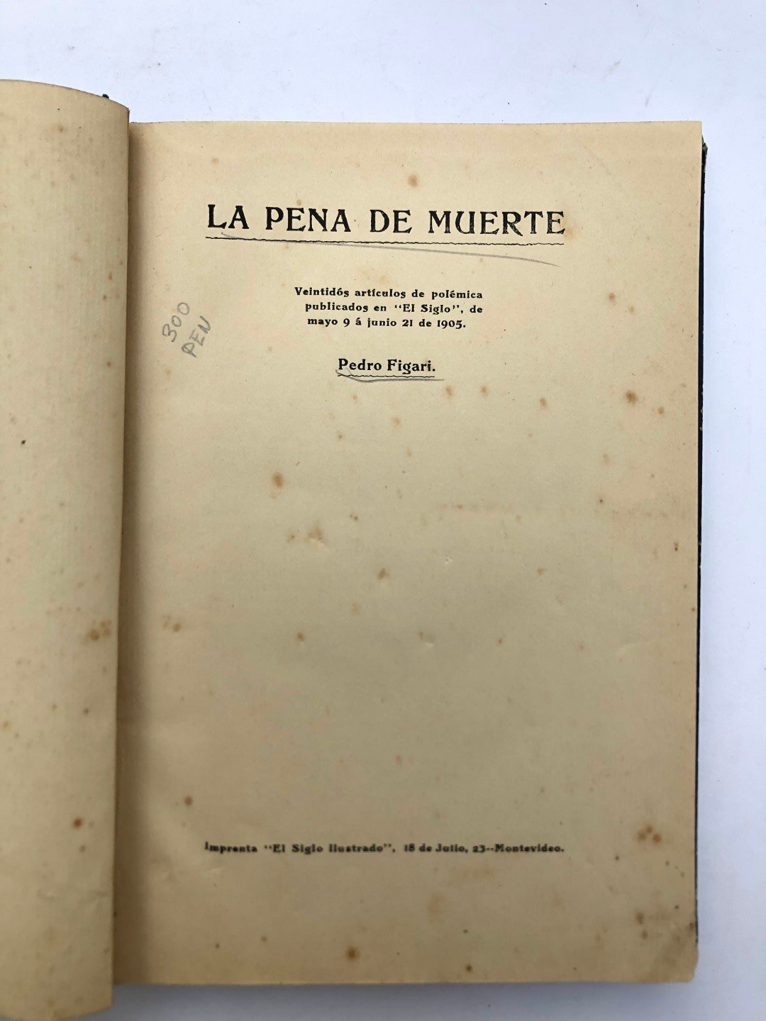 FIGARI, Pedro: La pena de muerte. Dedicado por el autor al ingeniero Florencio Michelson. Imprenta «El Siglo Ilustrado», Montevideo. Encuadernación tapa dura.