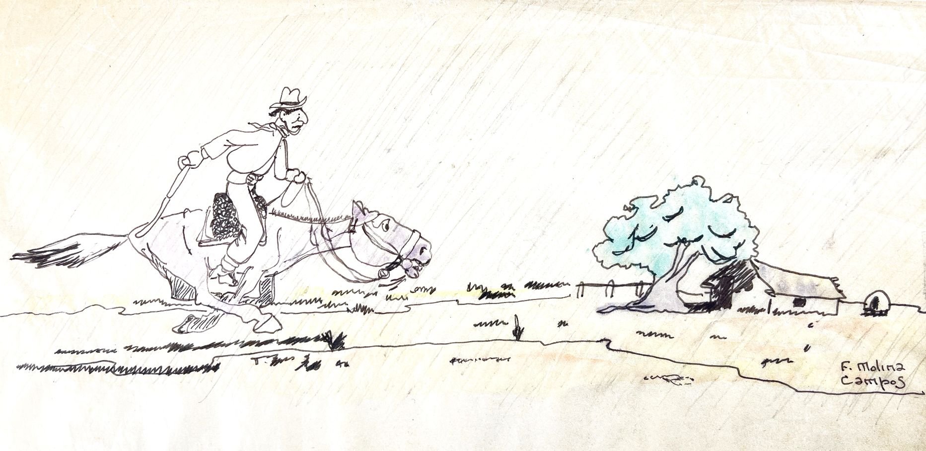 FLORENCIO MOLINA CAMPOS (Argentina 1891-1959). Tinta y lápiz color sobre papel. «Gaucho apurado», diseño de Molina Campos para sus hojas membretadas. Firmado abajo a la derecha. 19 x 36 cm.
