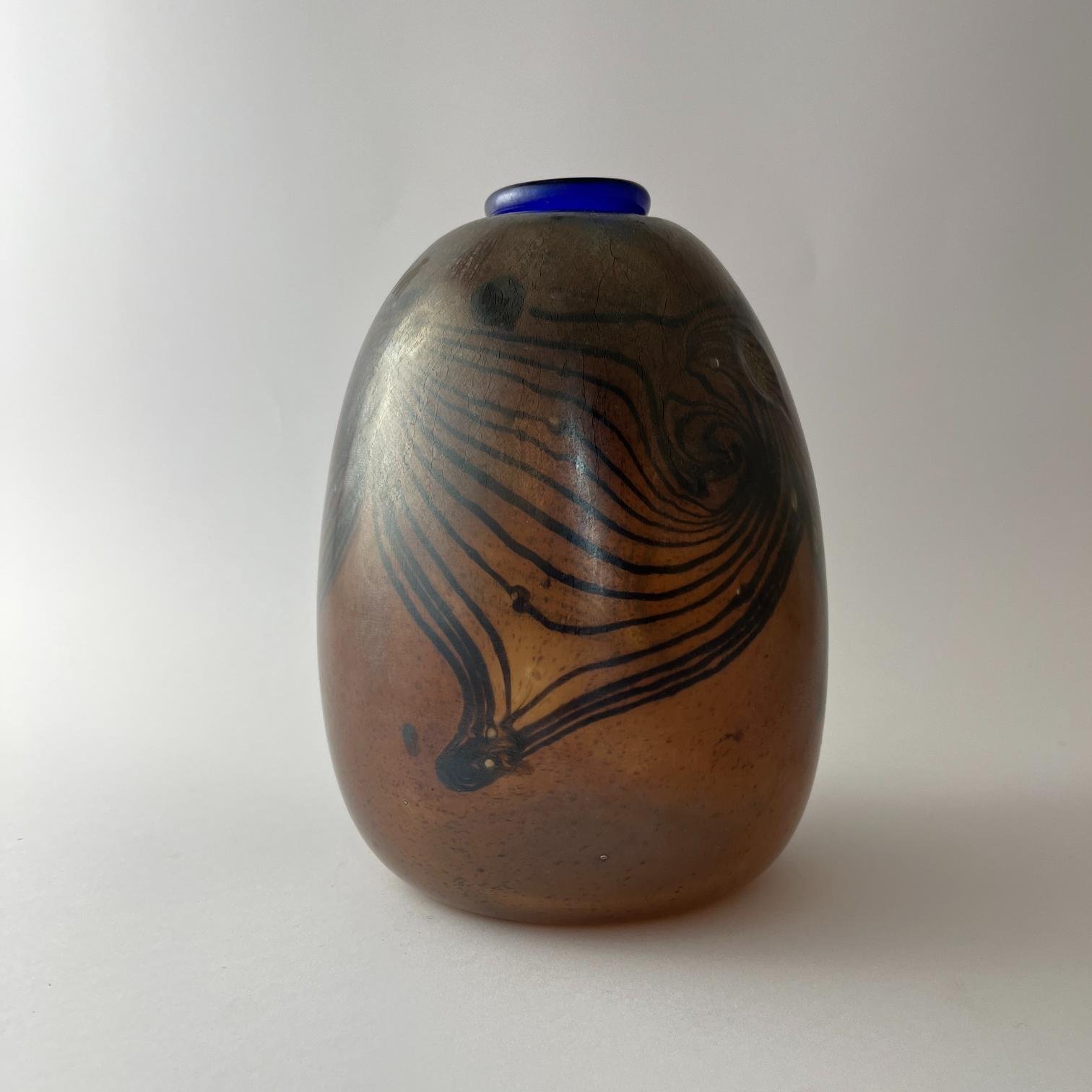 Florero alemán en cristal Eisch tornasolado en color ámbar y azul. Sellado «Eisch 77» en la base. 19 x 13 cm.
