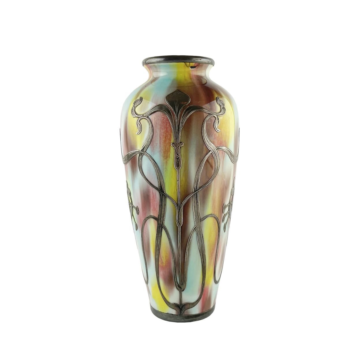 Florero art nouveau en cerámica esmaltada y policromada. Base, virola y aplicaciones en plata. Pequeña cascadura en boca. 15.5 x 7.5 cm.