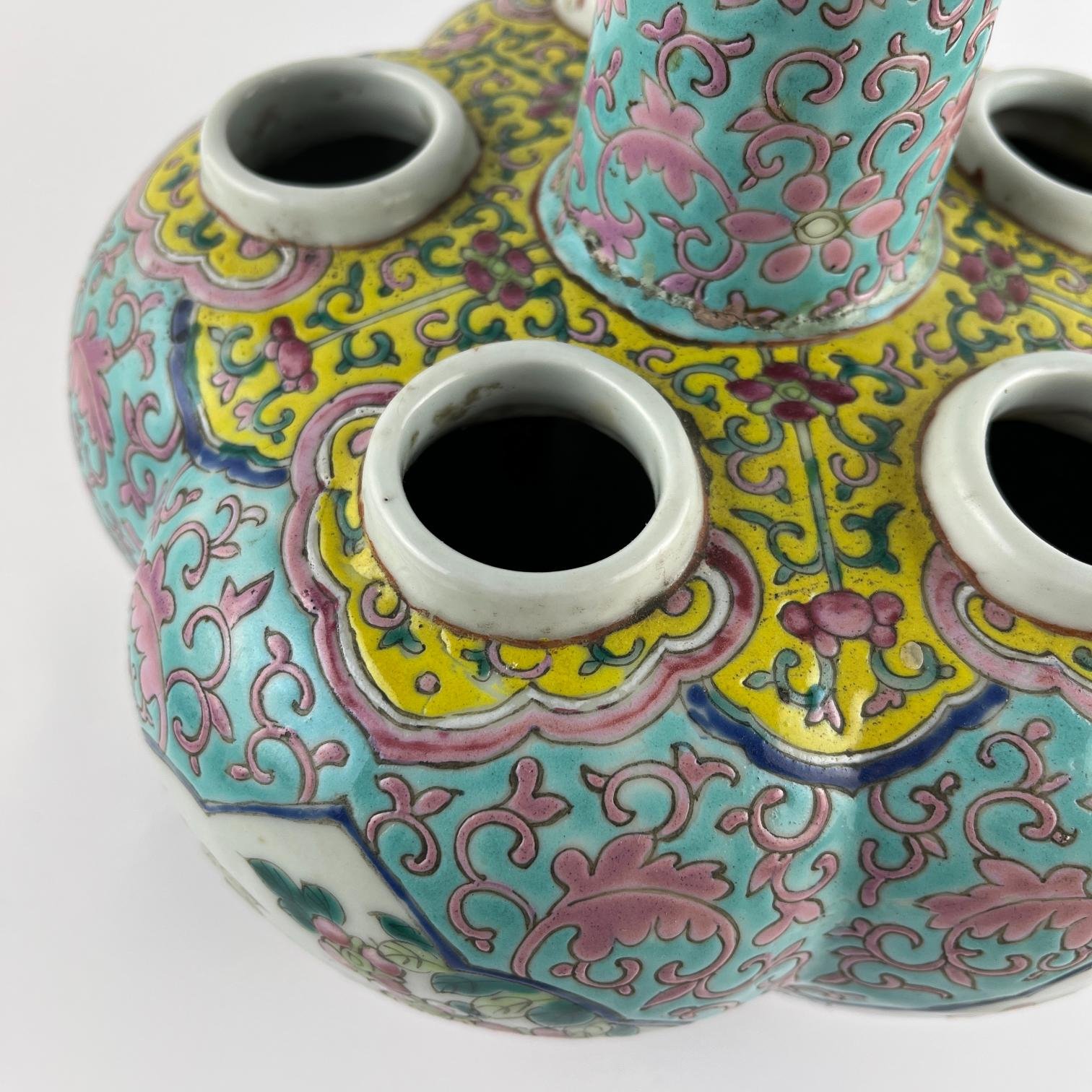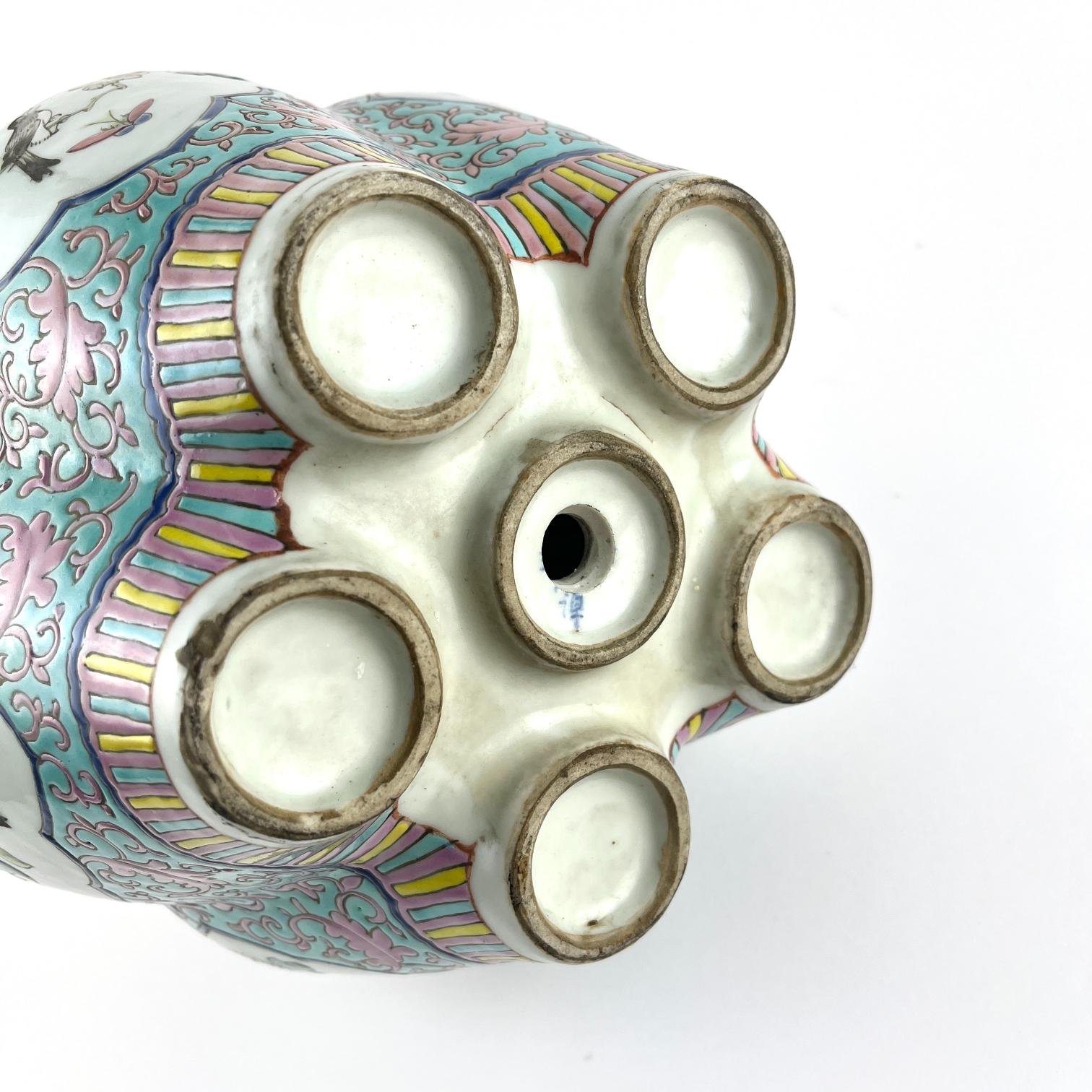 Florero chino en porcelana familia rosa s. XIX con cartuchos decorados «aves y flores», de cuerpo lobulado, con seis bocas, la central en forma de flor de loto. Base perforada. Alto 34 cm.