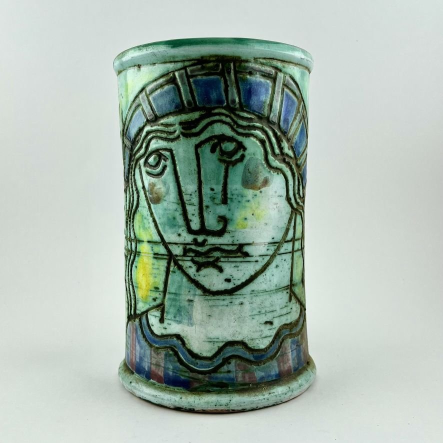 Florero en cerámica esmaltada y policromada. “Caras.” Realizado por el taller uruguayo “Cerámica del Carrito”, fundado en 1972 por la Escuela Nacional de Bellas Artes de la Universidad de la República. 22 x 14 cm.