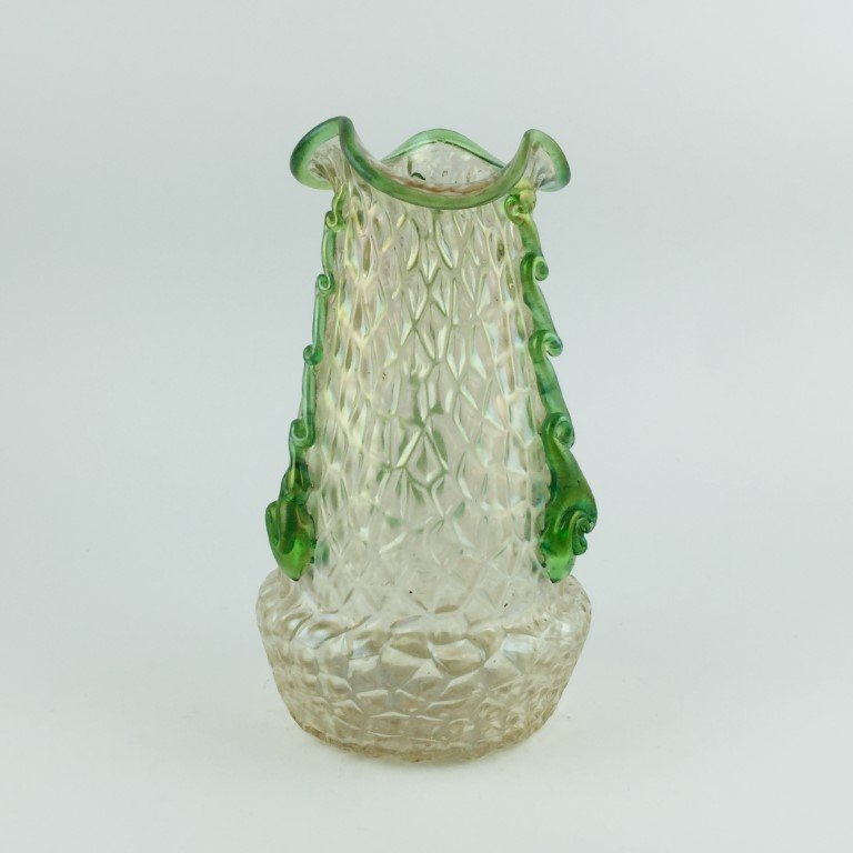 Florero en cristal tornasolado color blanco con detalles en verde. Borde en ondas. 17 x 10 cm.