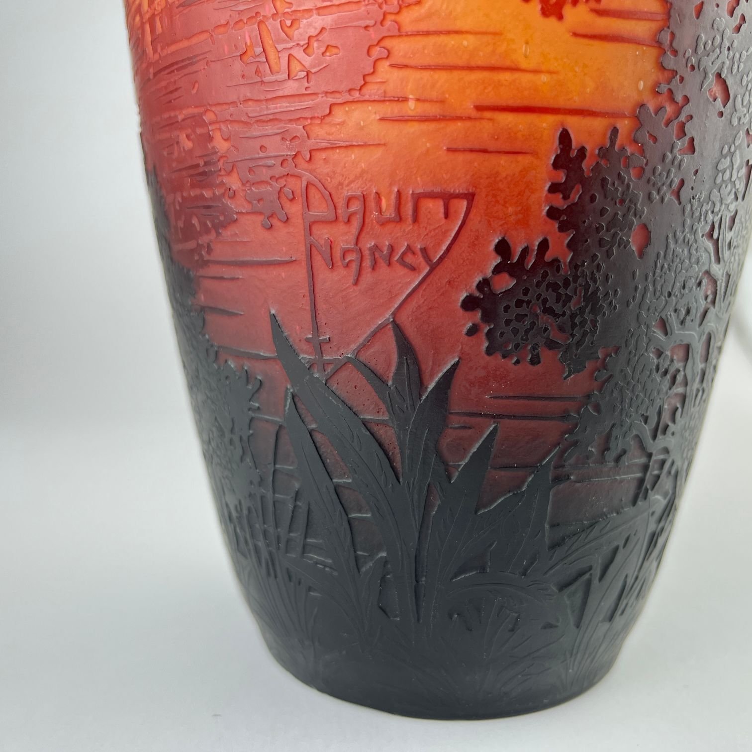 Florero francés en cristal Daum Nancy en colores anaranjado, bordeaux y marrón decorado «paisaje». Alto 38 cm.